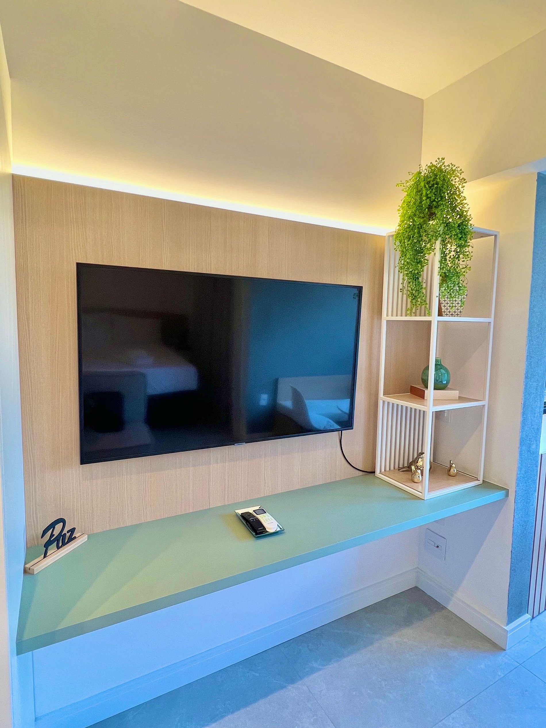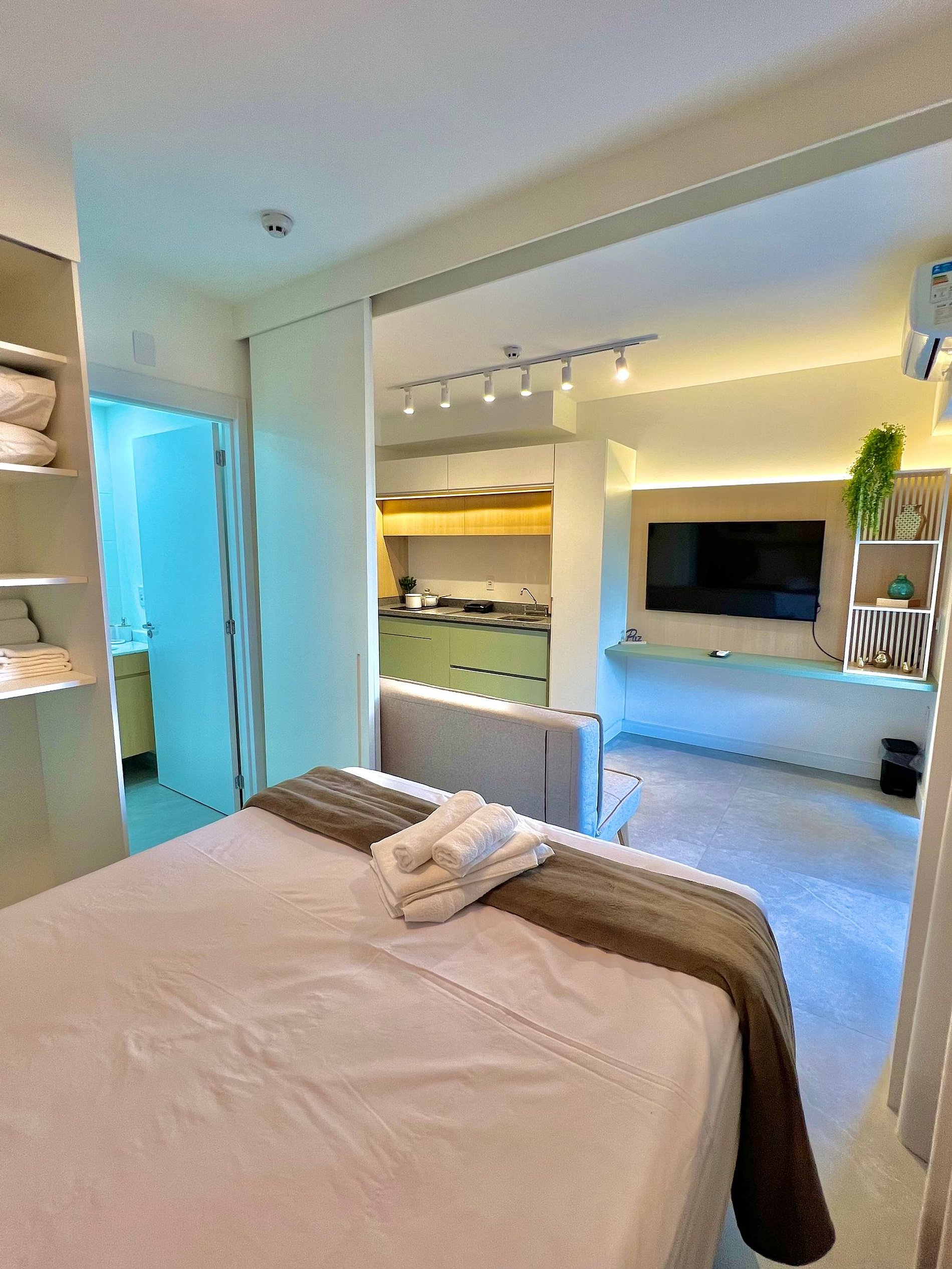 In the same space, there is a kitchen equipped with the necessary utensils for a practical stay, a bathroom, a closet, a home office desk, and a TV. There is also a balcony with glass-enclosed railing.