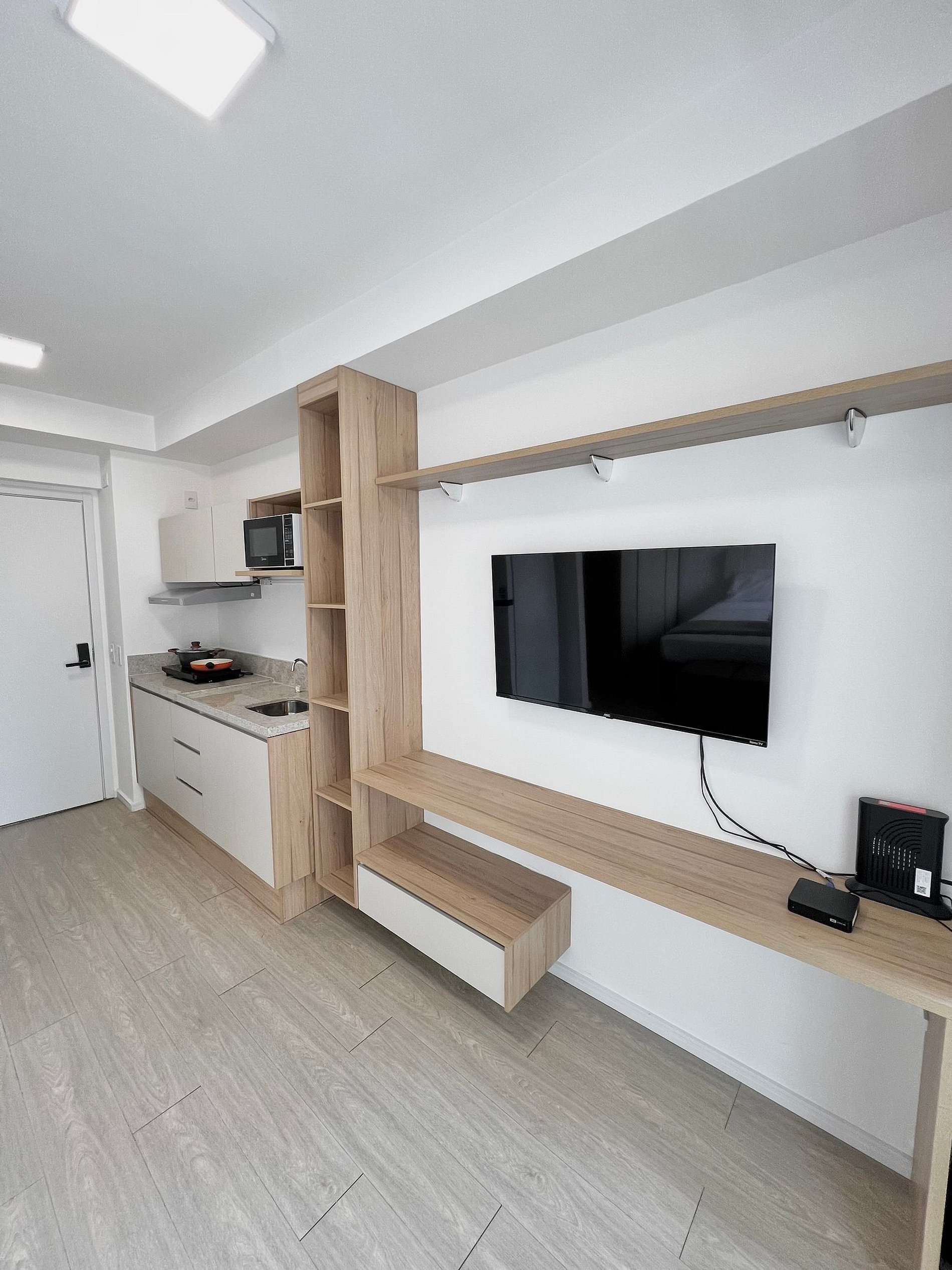In the same space, there's a kitchen equipped with the necessary utensils for a practical stay, a bathroom, a closet, a home office desk, and a Smart TV. There's also a balcony with glass-enclosed railing.
