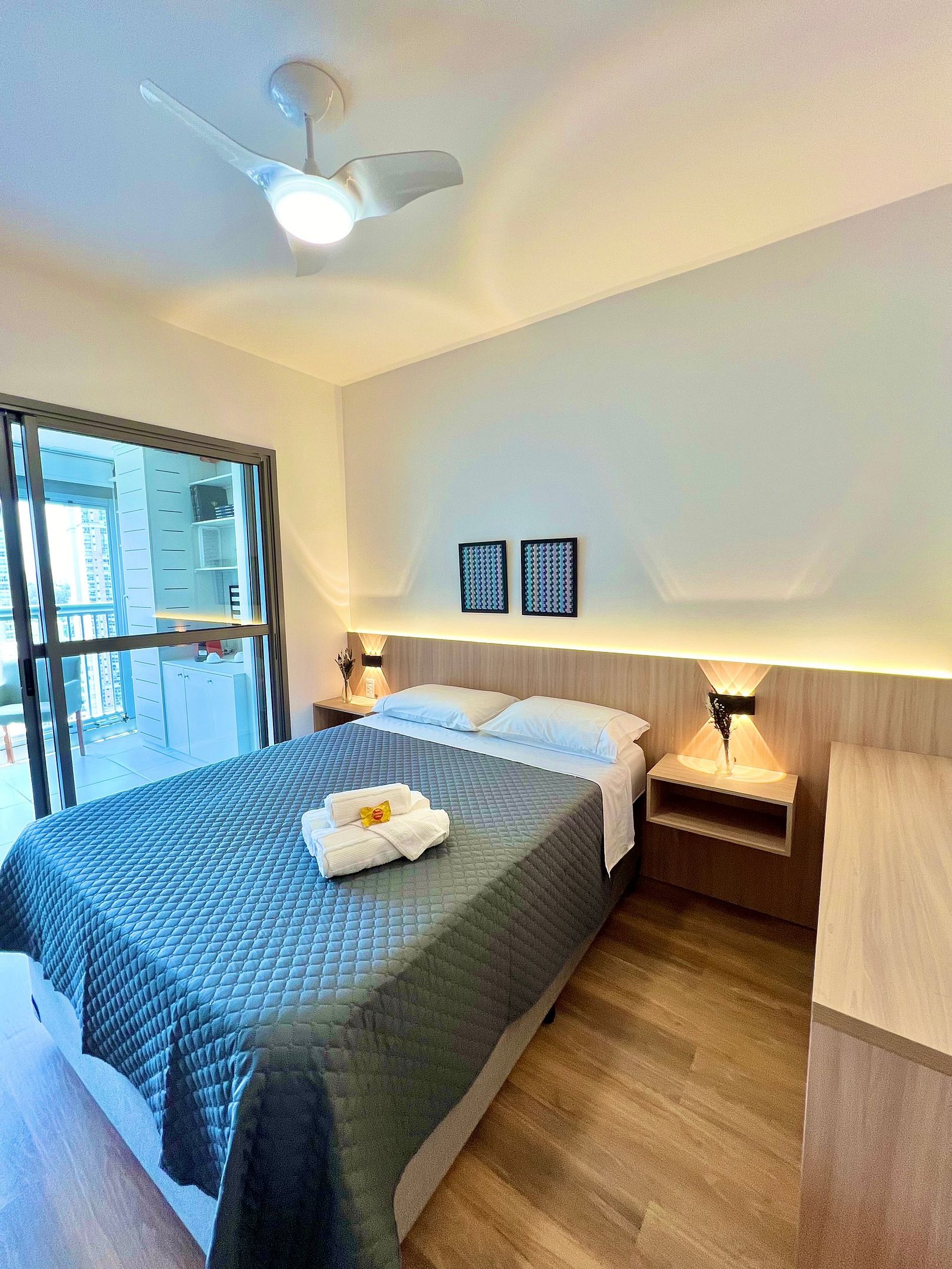 Apartamento possui cama de casal, armários planejados, bancada para refeições, wi-fi de alta velocidade, vista livre para o bairro, iluminação aconchegante para leituras e momentos de descanso.