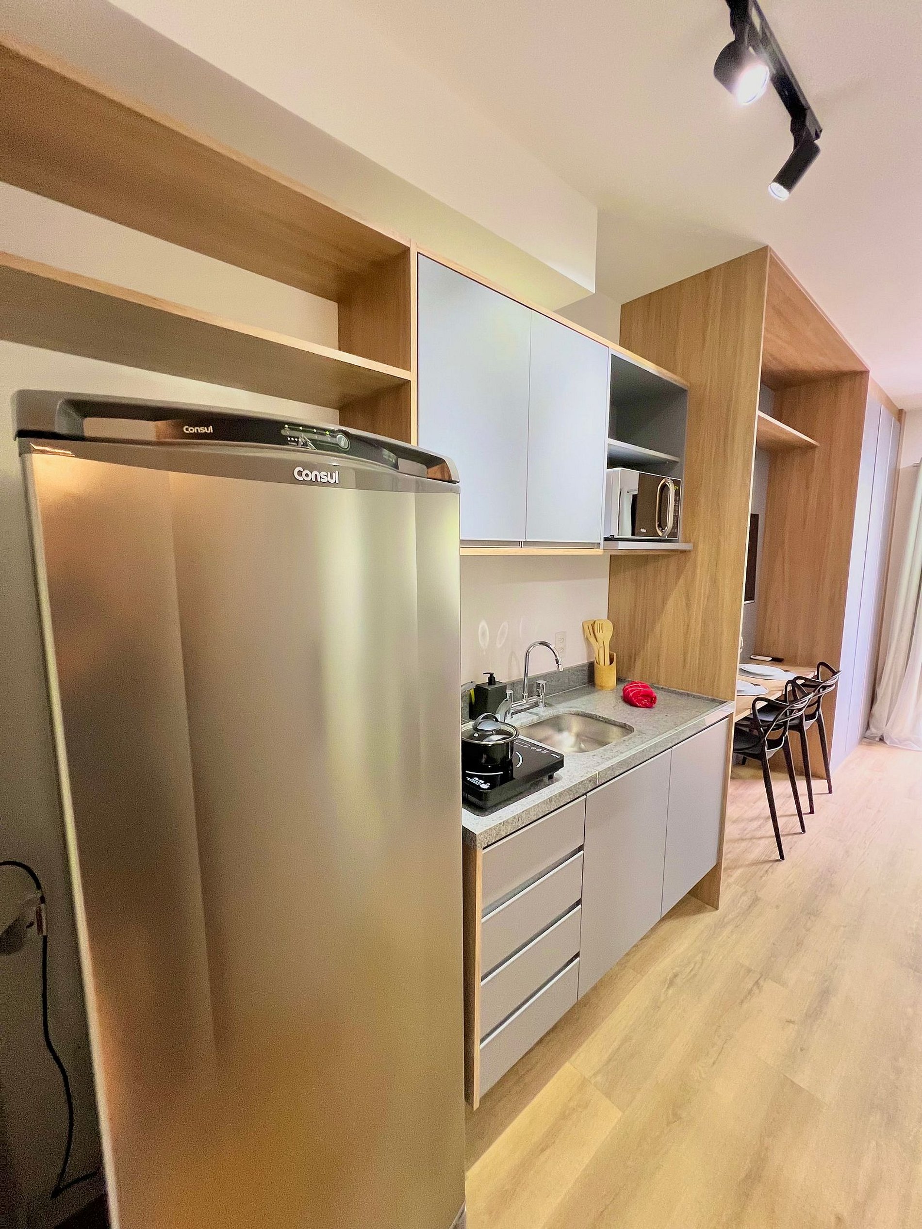 Apartamento completo, possui todos os utensílios de cozinha, roupa de cama e marcenaria planejada, tudo pensado para o seu conforto durante a hospedagem.