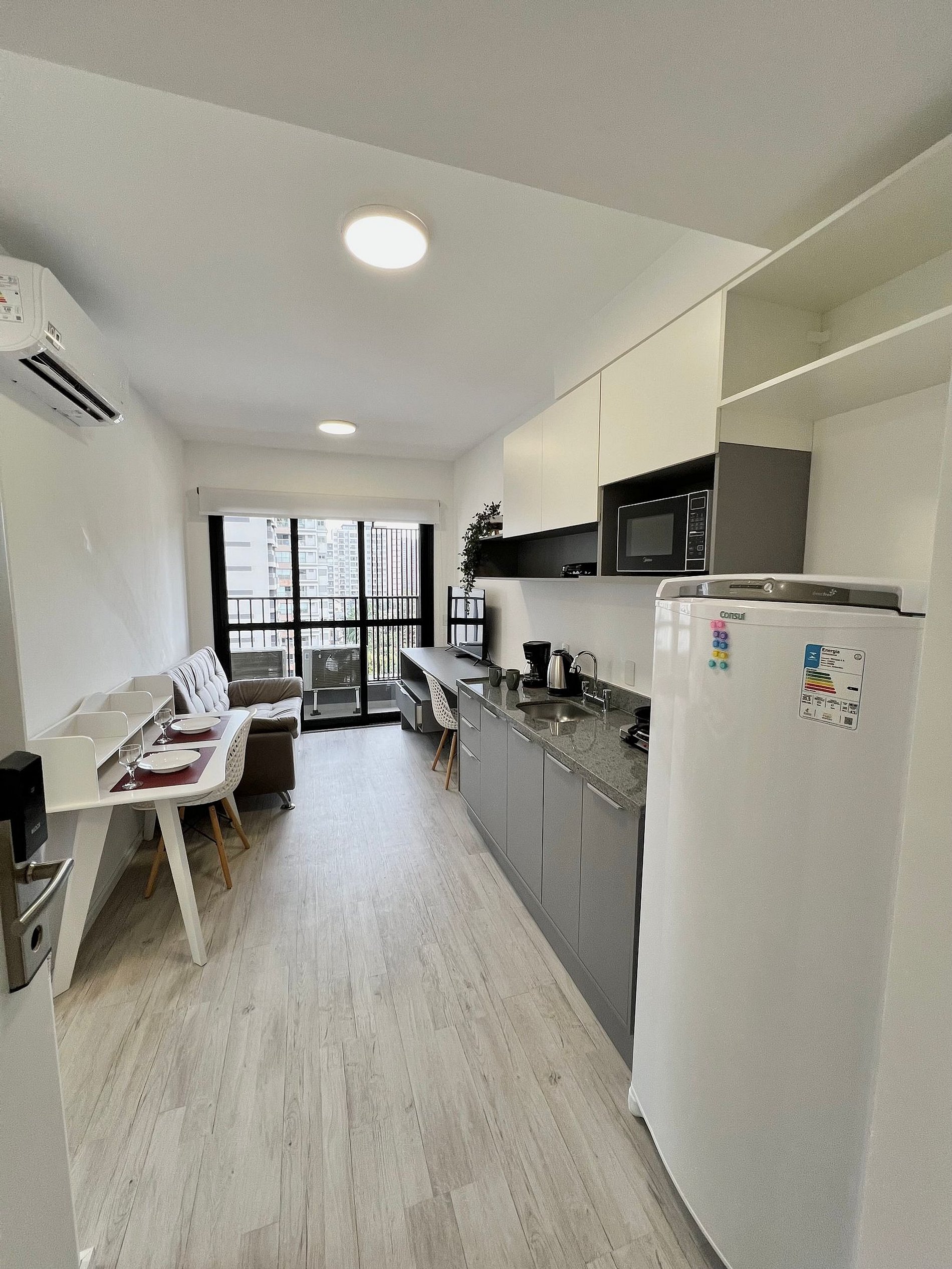 Apartamento completo, possui todos os utensílios de cozinha, roupa de cama e marcenaria planejada, tudo pensado para o seu conforto durante a hospedagem.