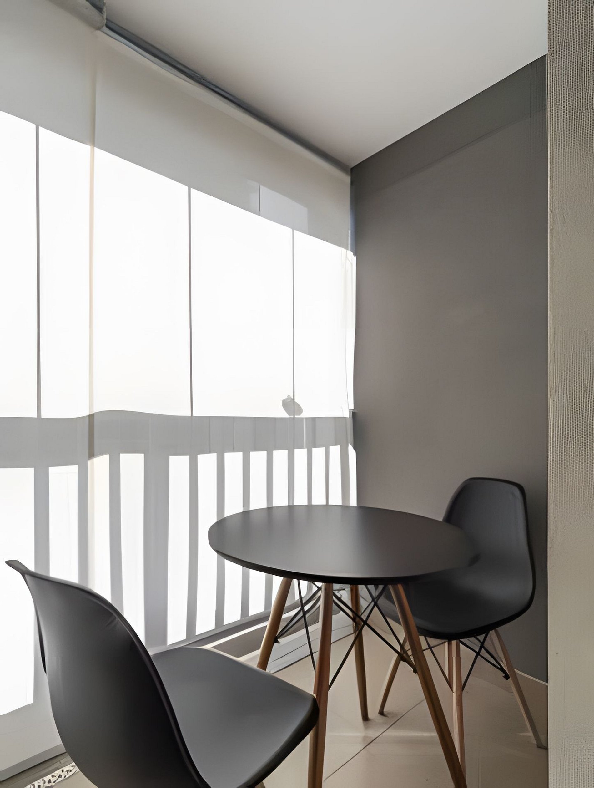 En el mismo espacio, hay una cocina equipada con los utensilios necesarios para una estancia práctica, un baño, un armario, un escritorio para el trabajo desde casa y un televisor inteligente. También hay un balcón con barandilla cerrada de vidrio.