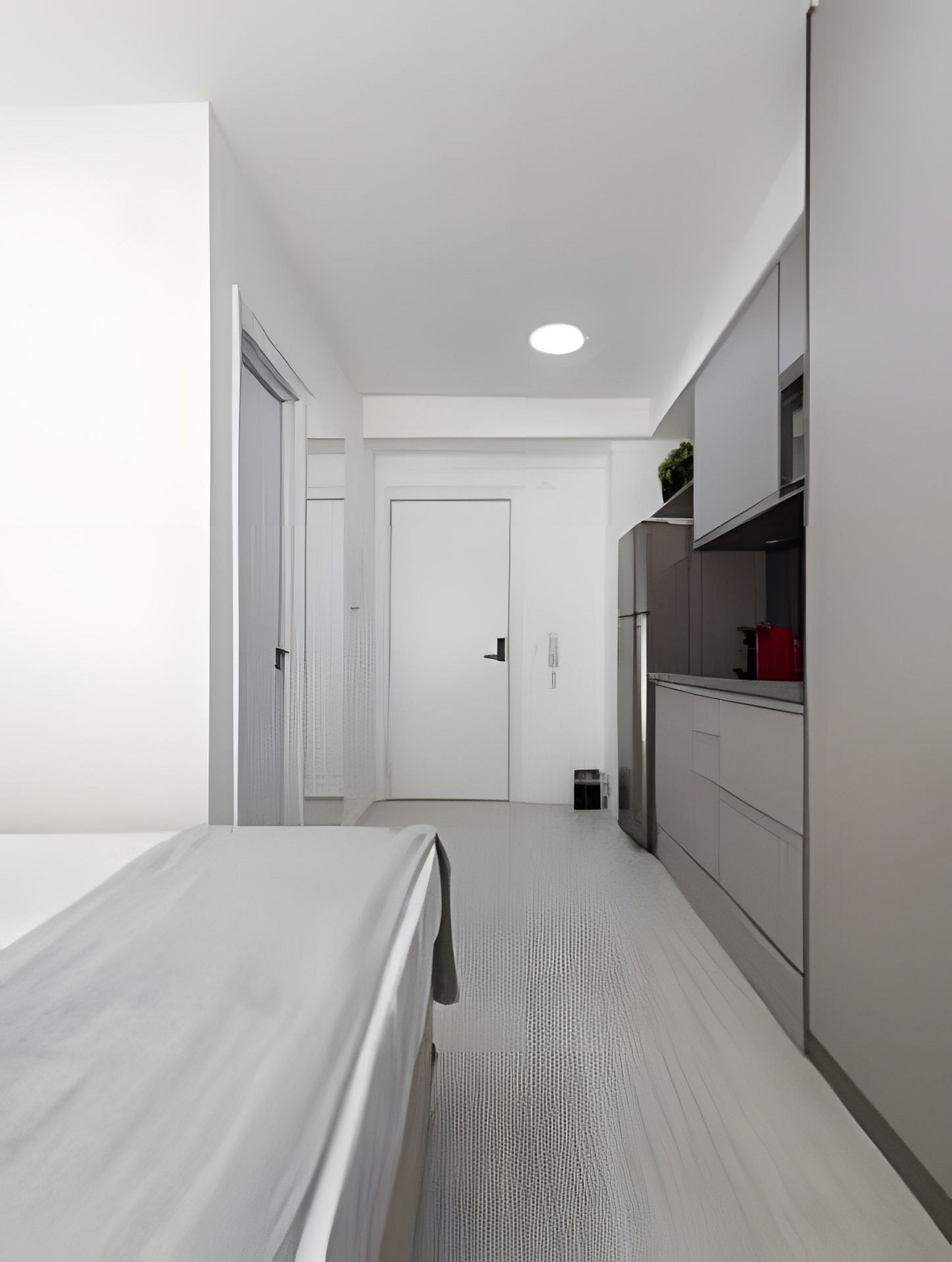 En el mismo espacio, hay una cocina equipada con los utensilios necesarios para una estancia práctica, un baño, un armario, un escritorio para el trabajo desde casa y un televisor inteligente. También hay un balcón con barandilla cerrada de vidrio.