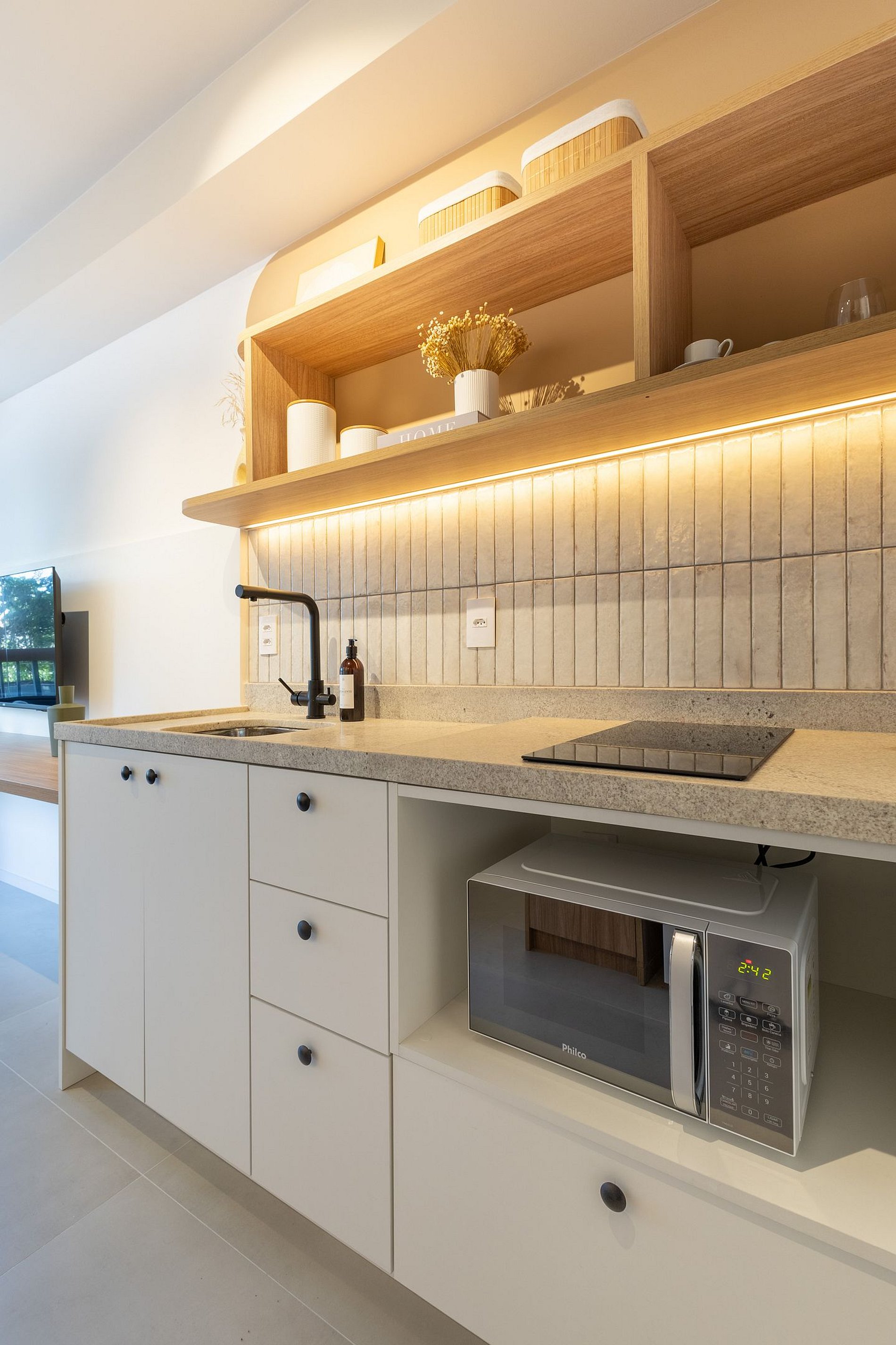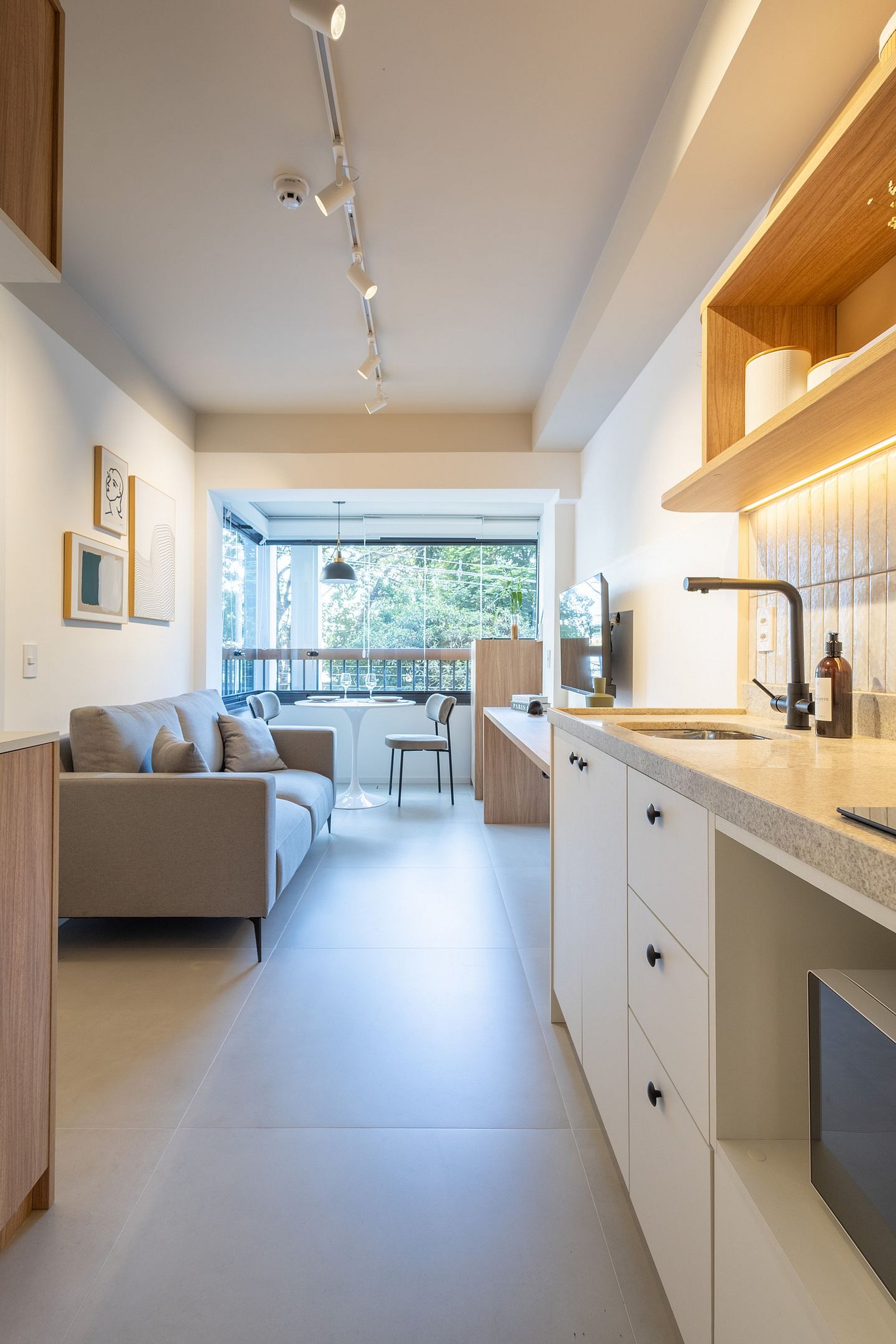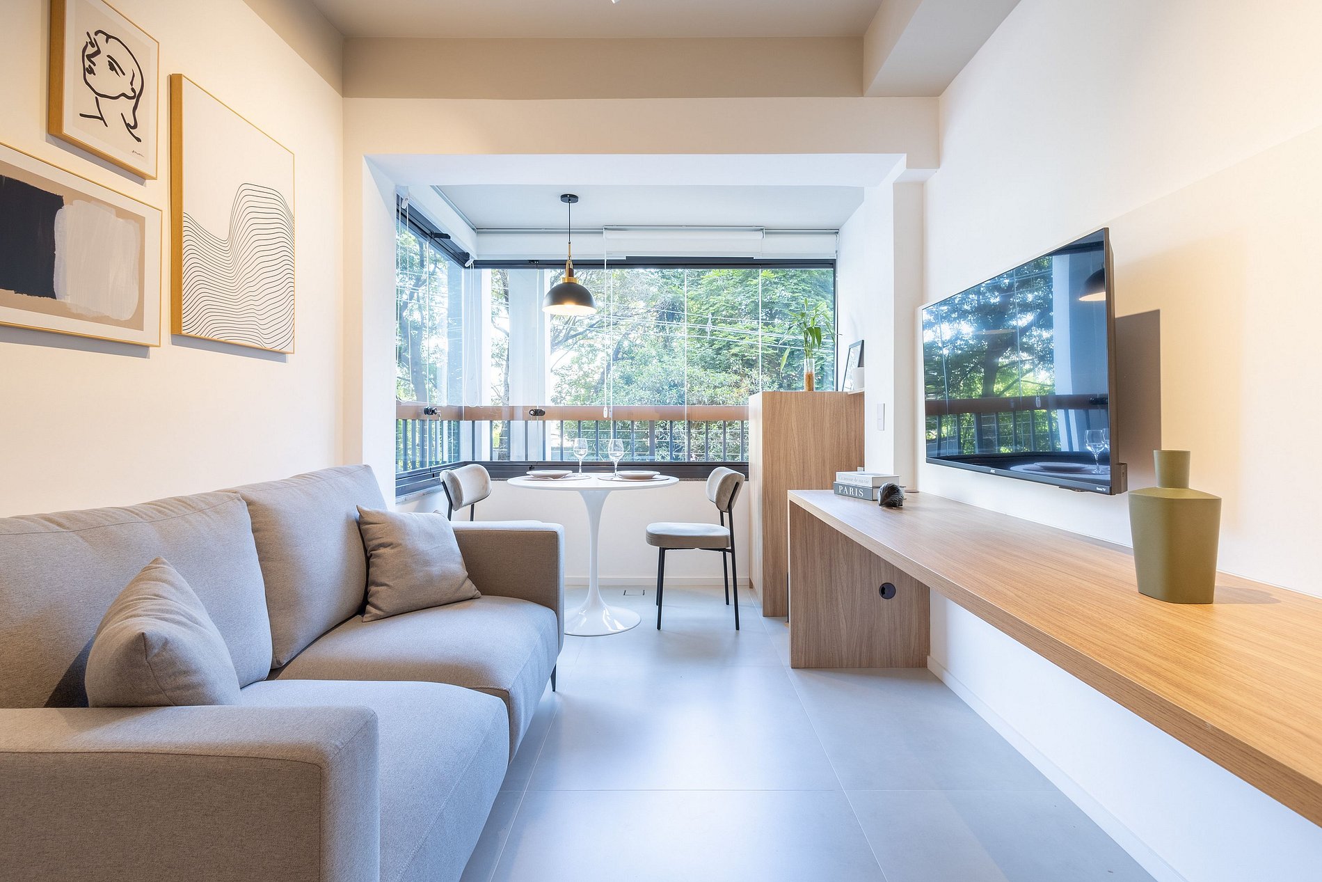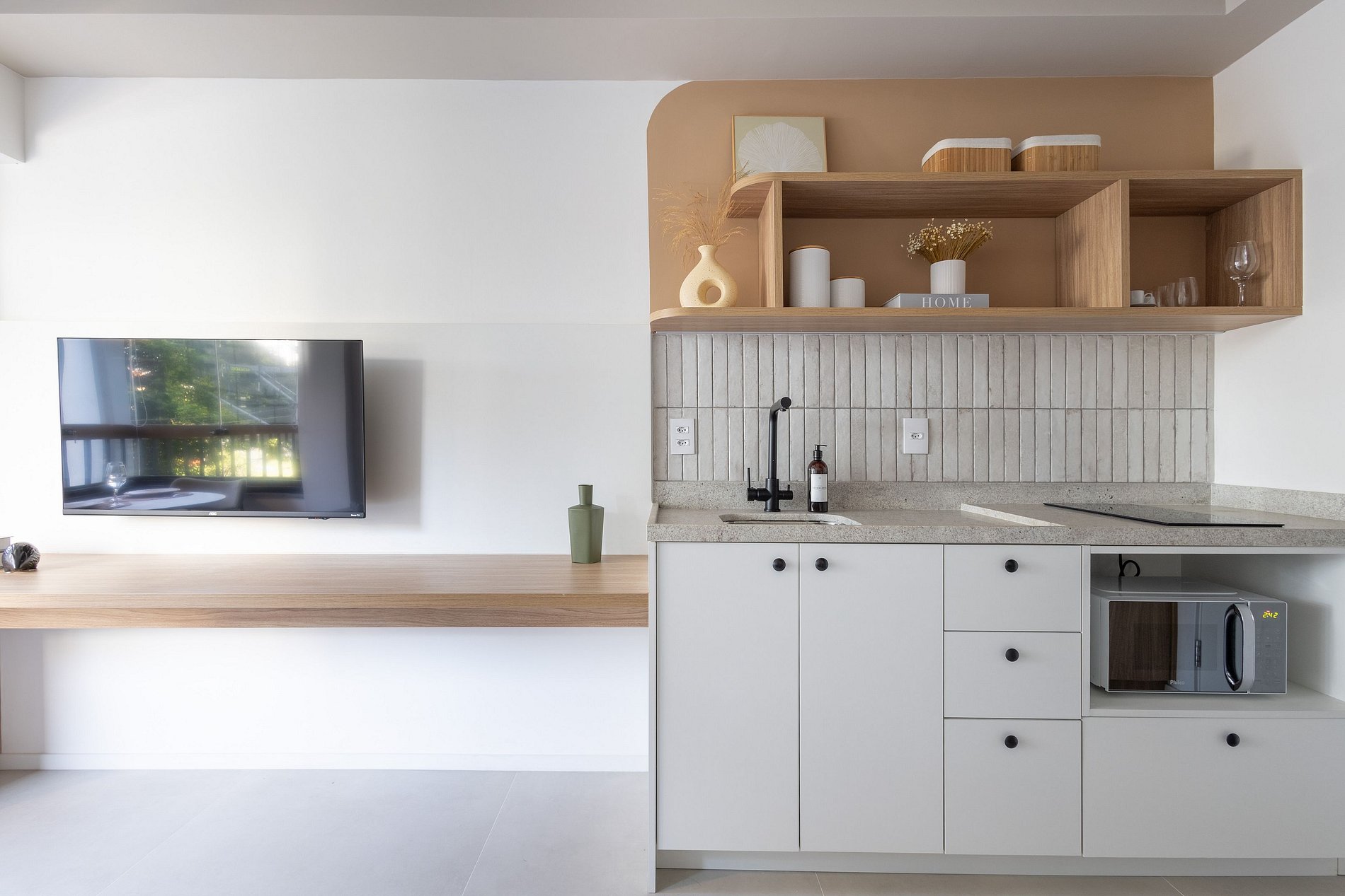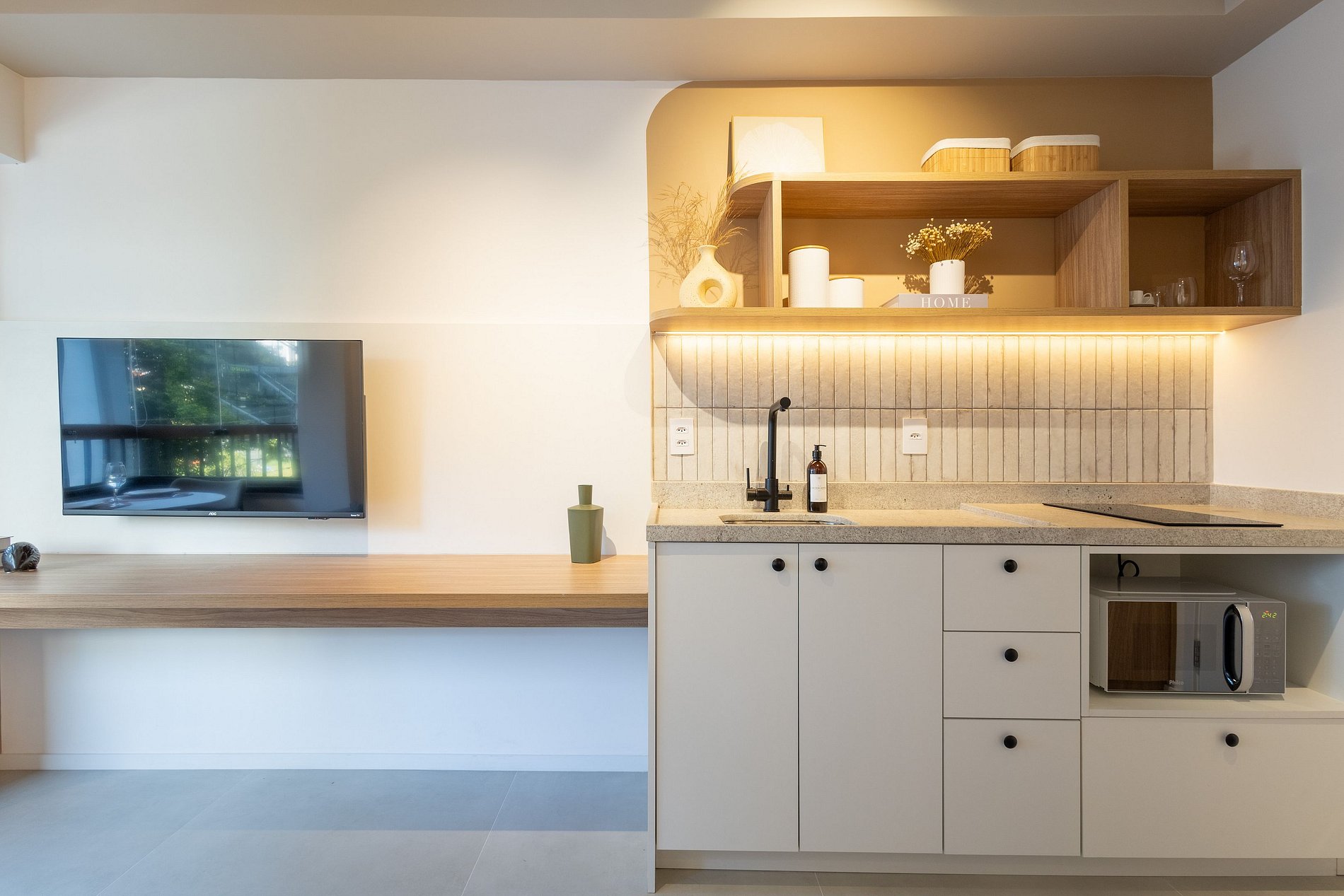 En el mismo espacio, contamos con una cocina equipada con los utensilios necesarios para una estancia práctica, un baño, un armario, un escritorio para trabajar desde casa y una televisión. También hay un balcón con cerramiento de vidrio.