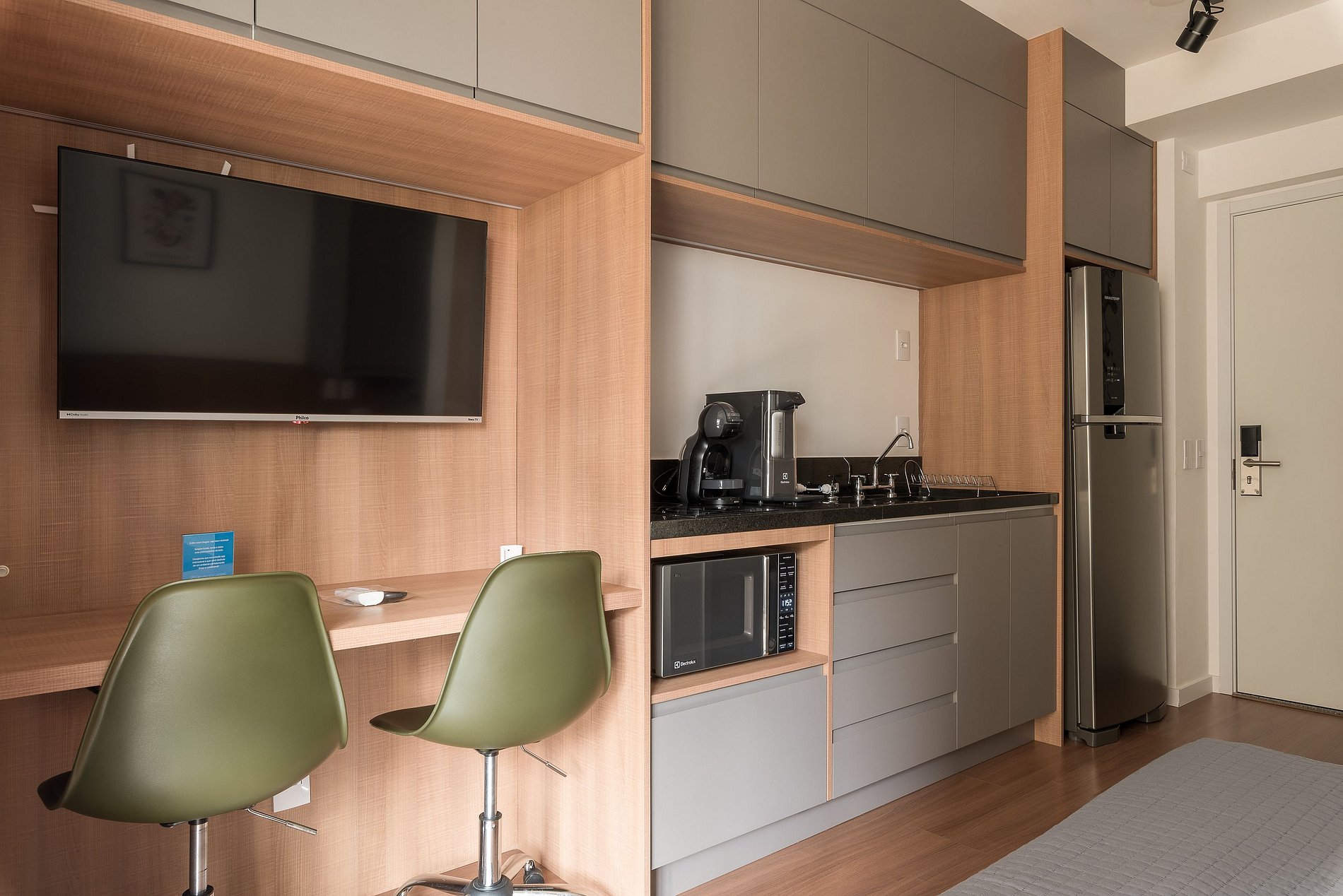En el mismo espacio, hay una cocina equipada con los utensilios necesarios para una estancia práctica, un baño, un armario, un escritorio para el trabajo desde casa y un televisor inteligente.