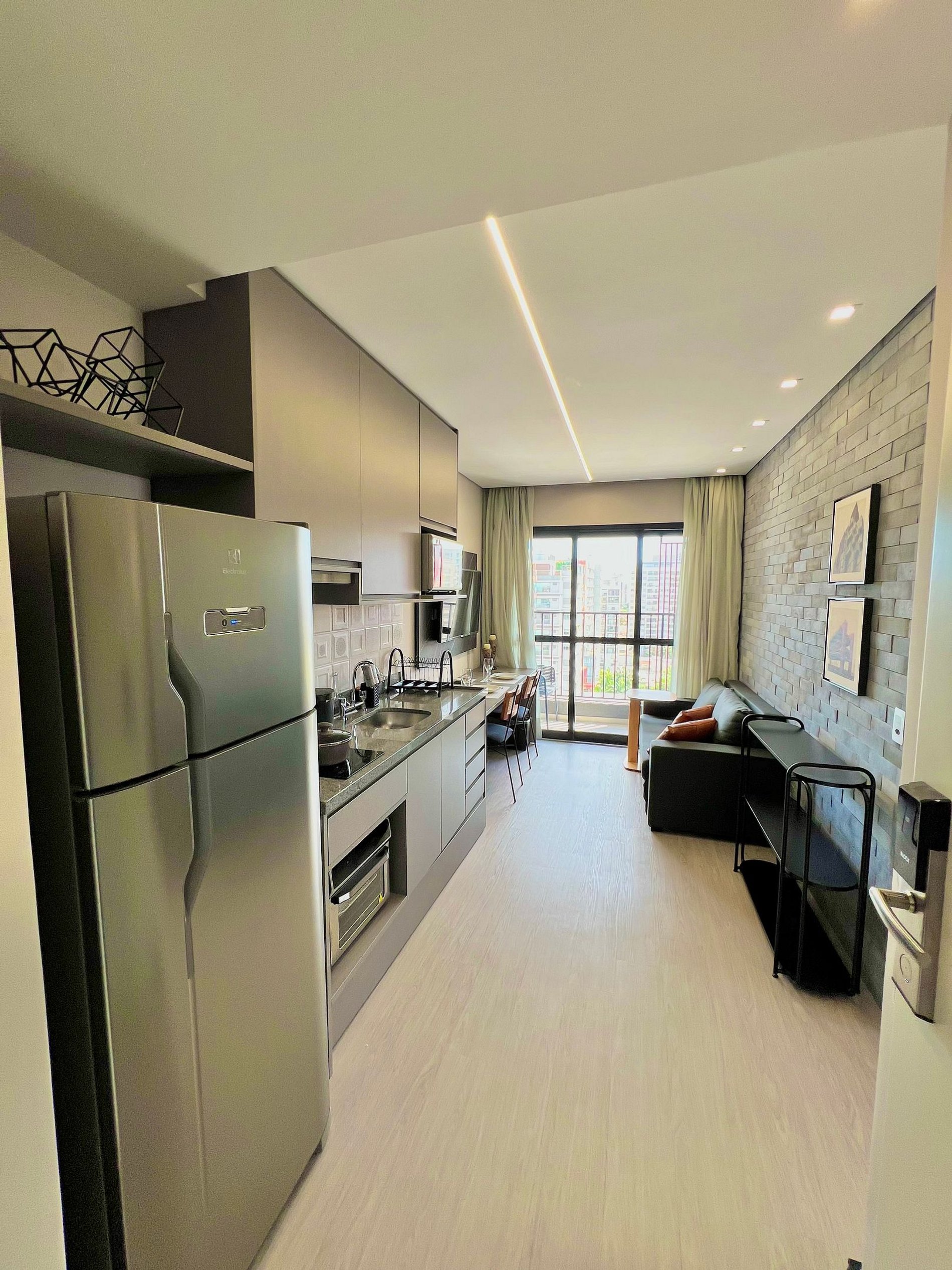 Apartamento completo, possui todos os utensílios de cozinha, roupa de cama e marcenaria planejada, tudo pensado para o seu conforto durante a hospedagem.