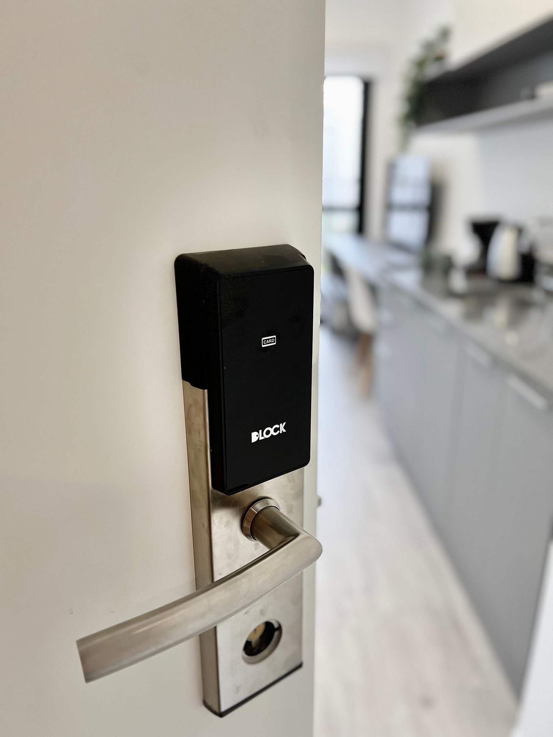 Condomínio moderno com acesso por senhas e cadastros remotos.
