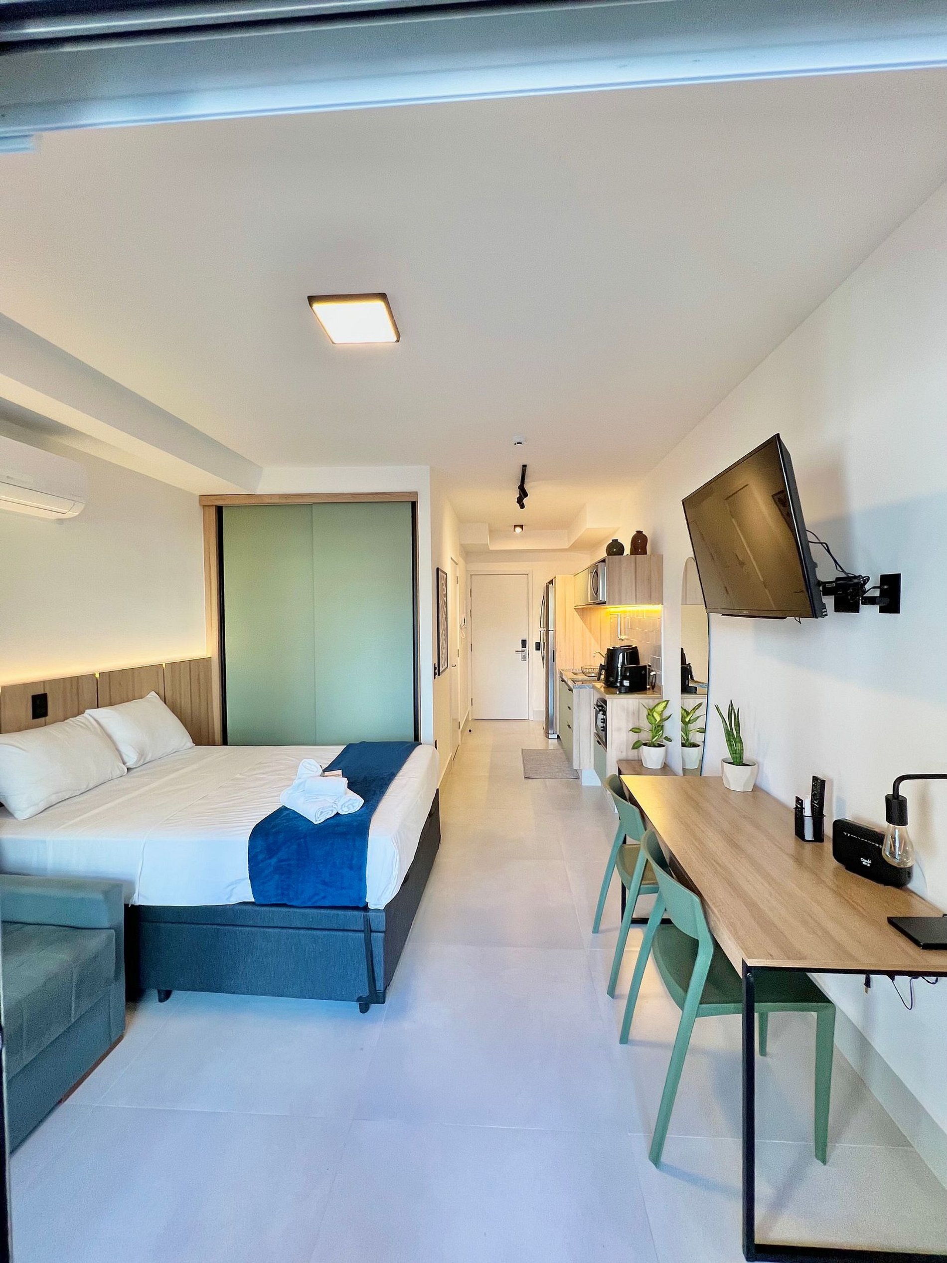 O Studio possui tudo para sua experiência e conforto, com uma cama e um sofá cama super confortáveis, o apartamento está completamente mobiliado, pensado na sua comodidade e dia a dia, contém todos os itens necessários na cozinha, como forno microondas, forno elétrico, cooktop, AirFryer, sanduicheira e cafeteira elétrica.