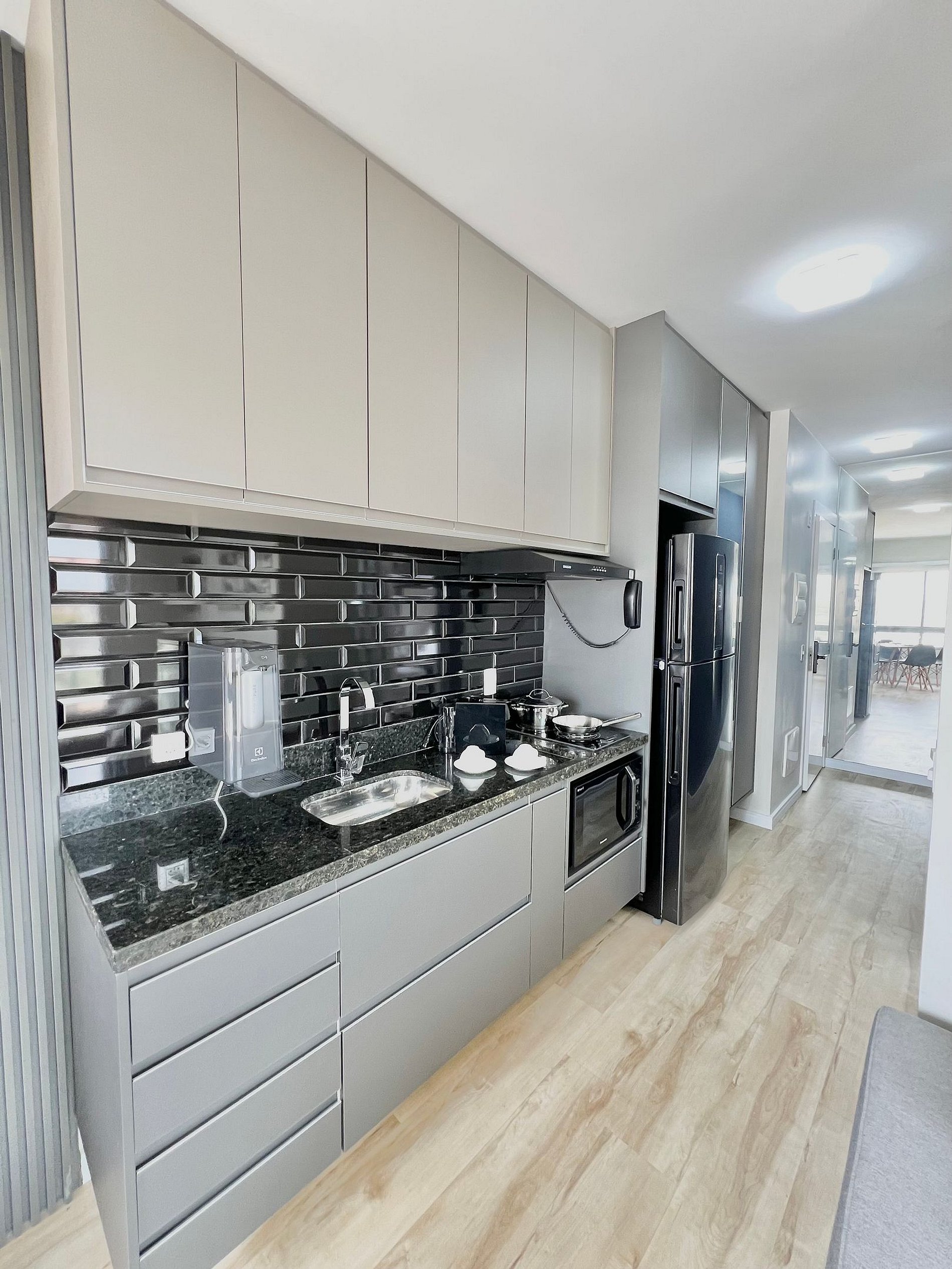 Cozinha completa com geladeira, cooktop, forno, micro-ondas, cafeteira e utensílios diversos.
