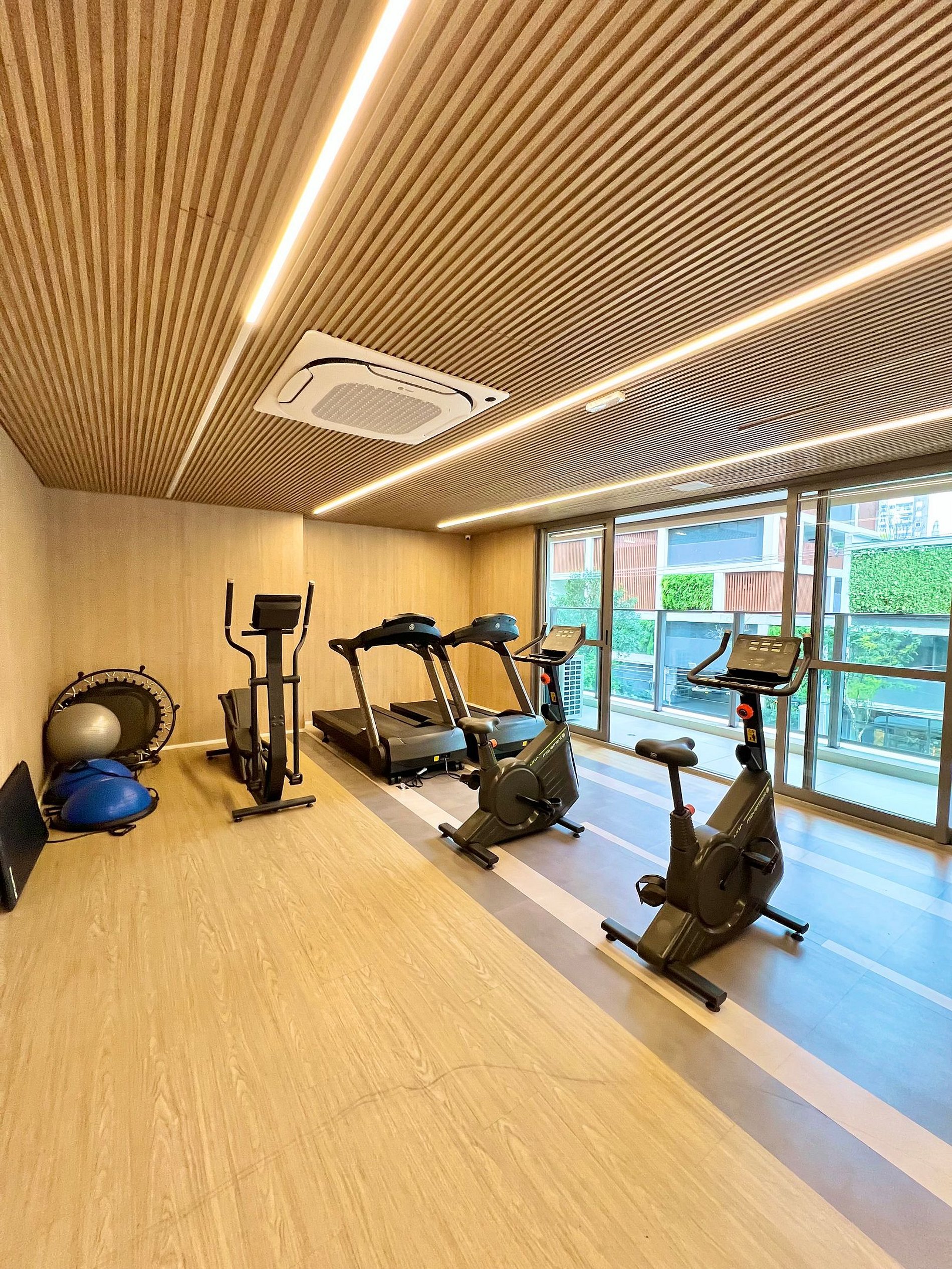 Ar-condicionado, espaço de trabalho e varanda charmosa.