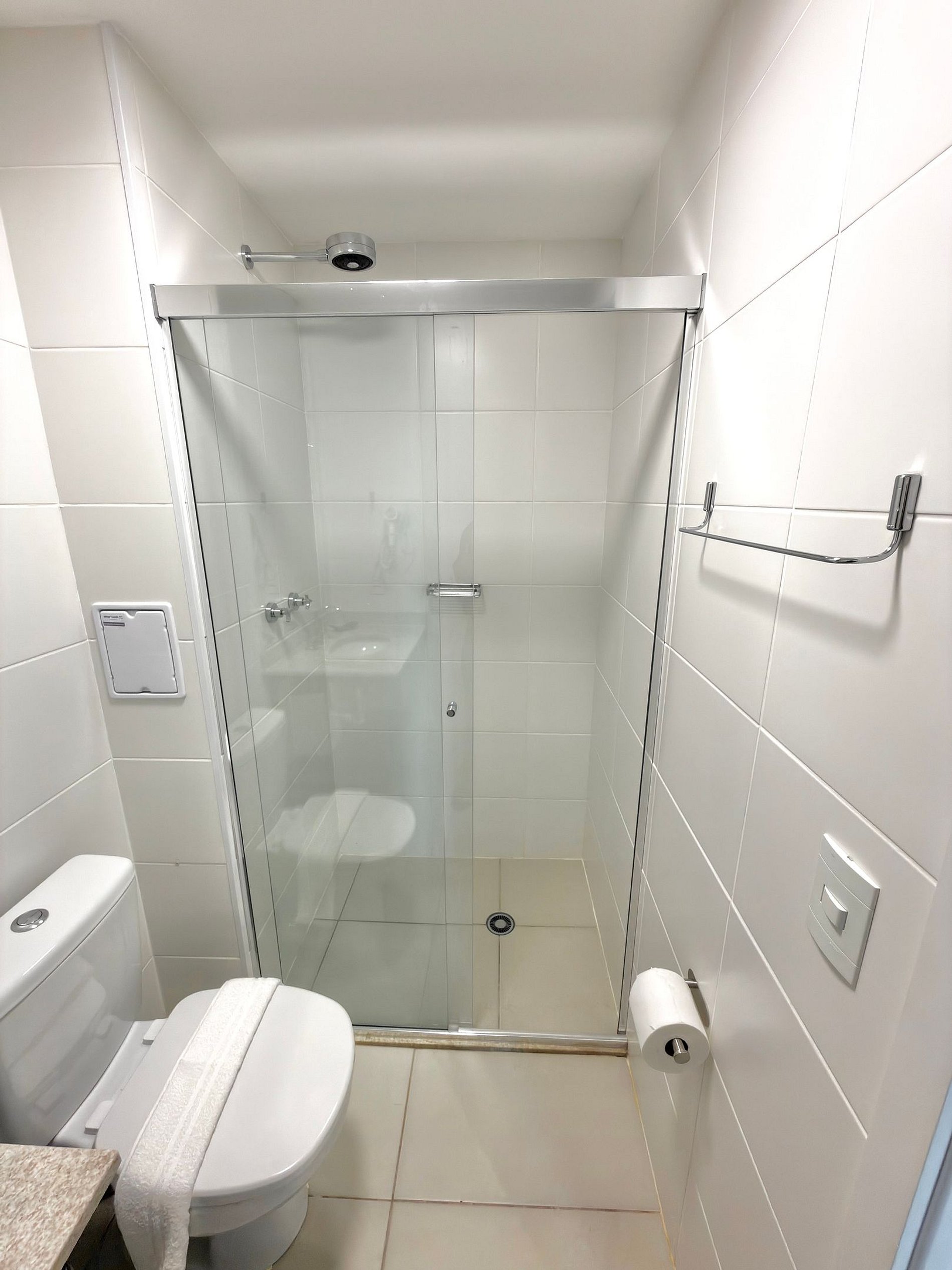 Banheiro completo com chuveiro aquecido, toalhas e itens essenciais.