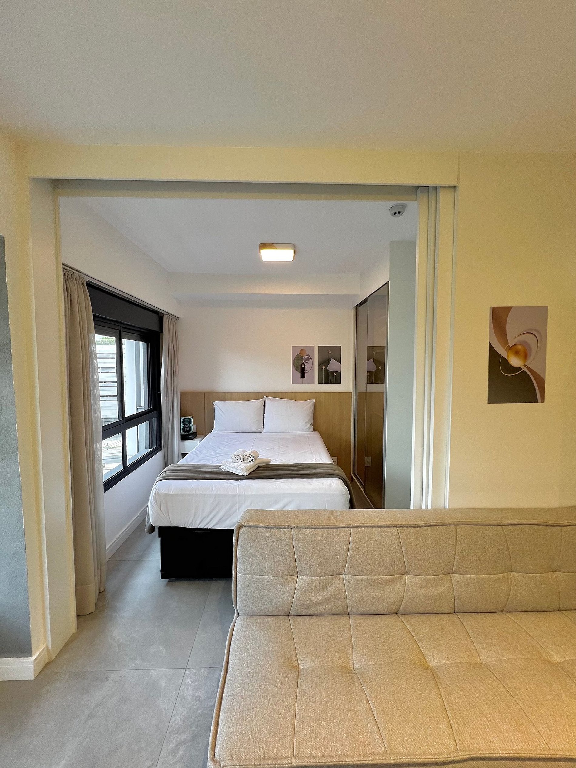 A acomodação dispõe de internet wi-fi fibra, enxoval completo, smart TV, espaço para home office, sala de estar com sofá, cooktop, micro-ondas, geladeira, utensílios de cozinha, cafeteira elétrica, luminária para leitura, ar-condicionado e fechamento da sacada em vidro. O prédio não possui vaga de garagem. O hóspede têm acesso ao coworking e wi-fi nas áreas comuns. O condomínio dispõe de lavanderia self-service OMO para lavagem e secagem (valores a parte e pagos diretamente pelo app).