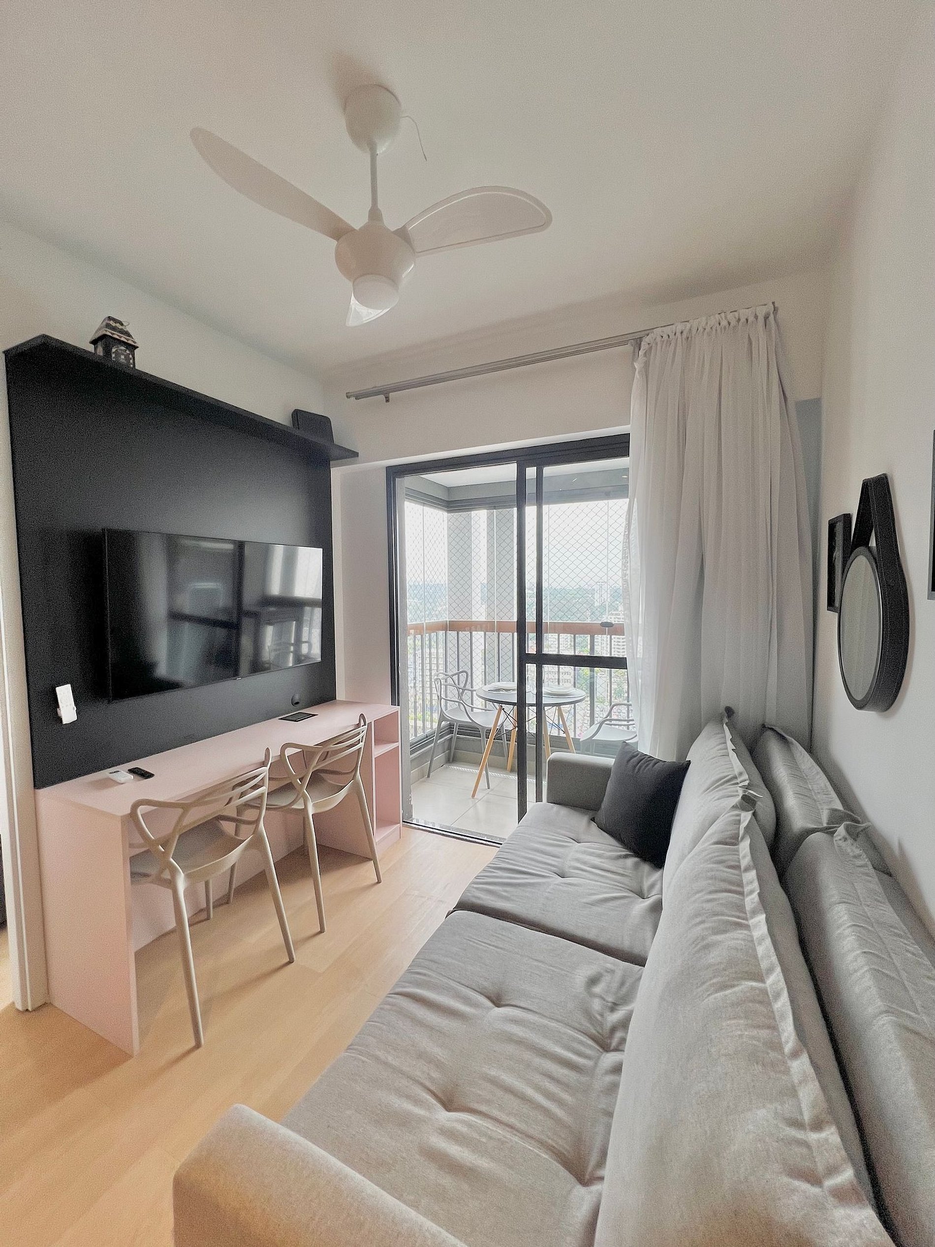 Possuimos cozinha totalmente equipada, com utensílios necessários para uma estadia prática e confortável, banheiro com armários planejados, suporte de toalhas, armários planejados nos demais cômodos, temos máquina de lavar roupas no apartamento, bancada para home office, mesa para refeição e TV Smart. Uma varanda com o fechamento da sacada em vidro e tela de proteção.