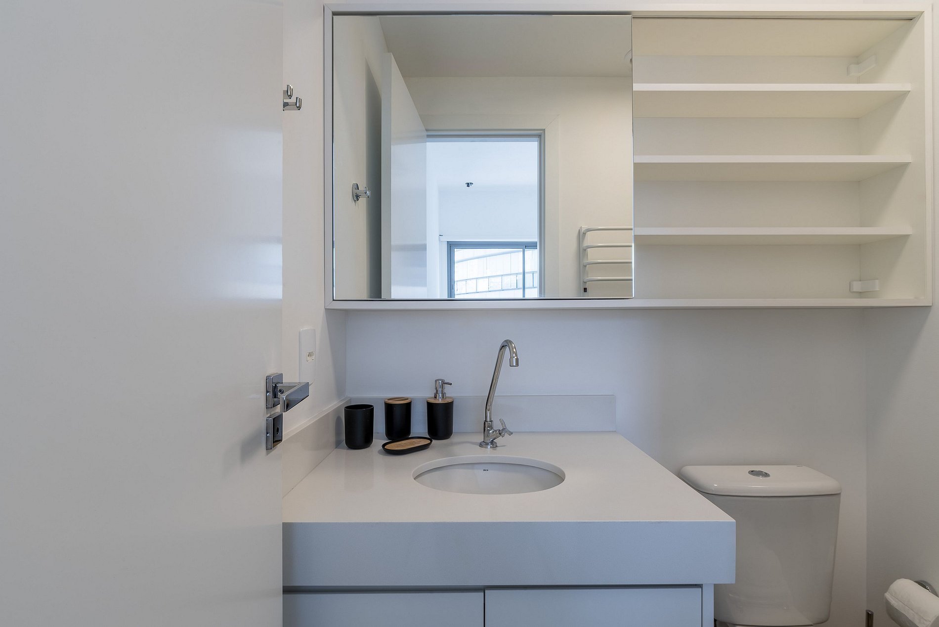 Localizado na área flat, o apartamento oferece acesso ao pátio externo do prédio e ao coworking localizado no térreo, que conta também com uma pequena loja self-service para produtos básicos como bebidas e snacks. O acesso é feito pela Avenida Santo Amaro, com portaria 24 horas.