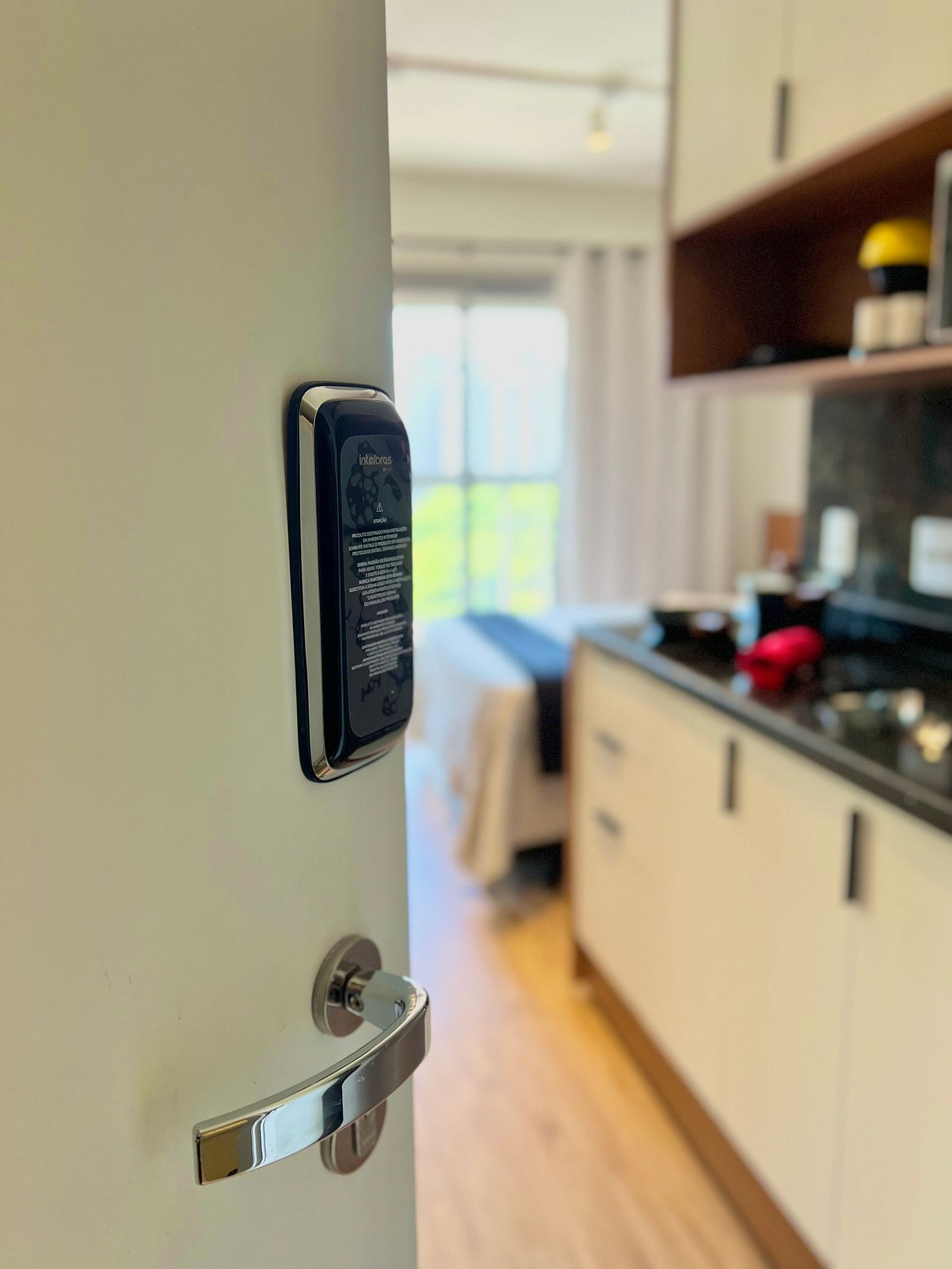 Condomínio moderno com acesso por senhas e cadastros remotos.