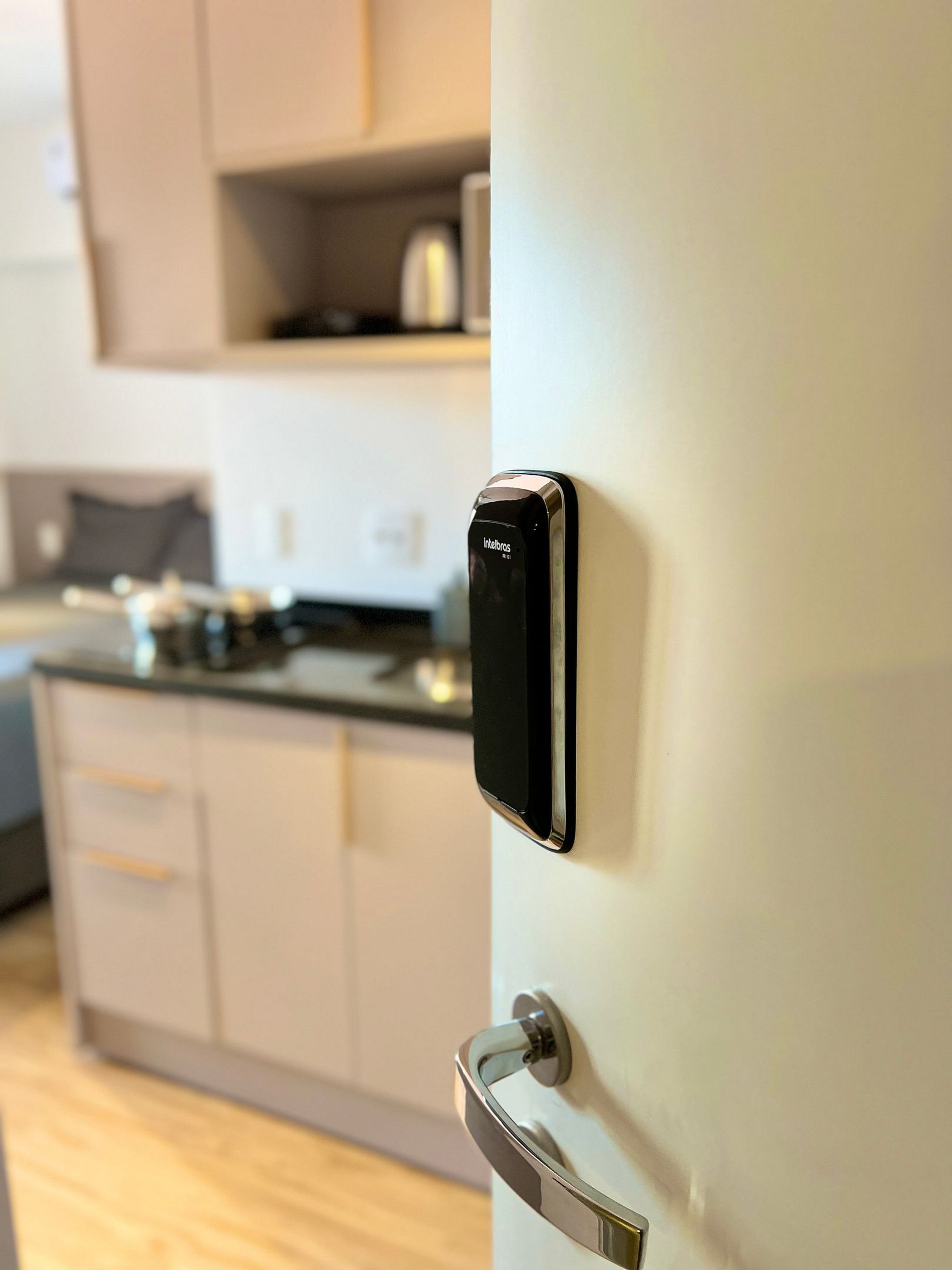 Condomínio moderno com acesso por senhas e cadastros remotos.