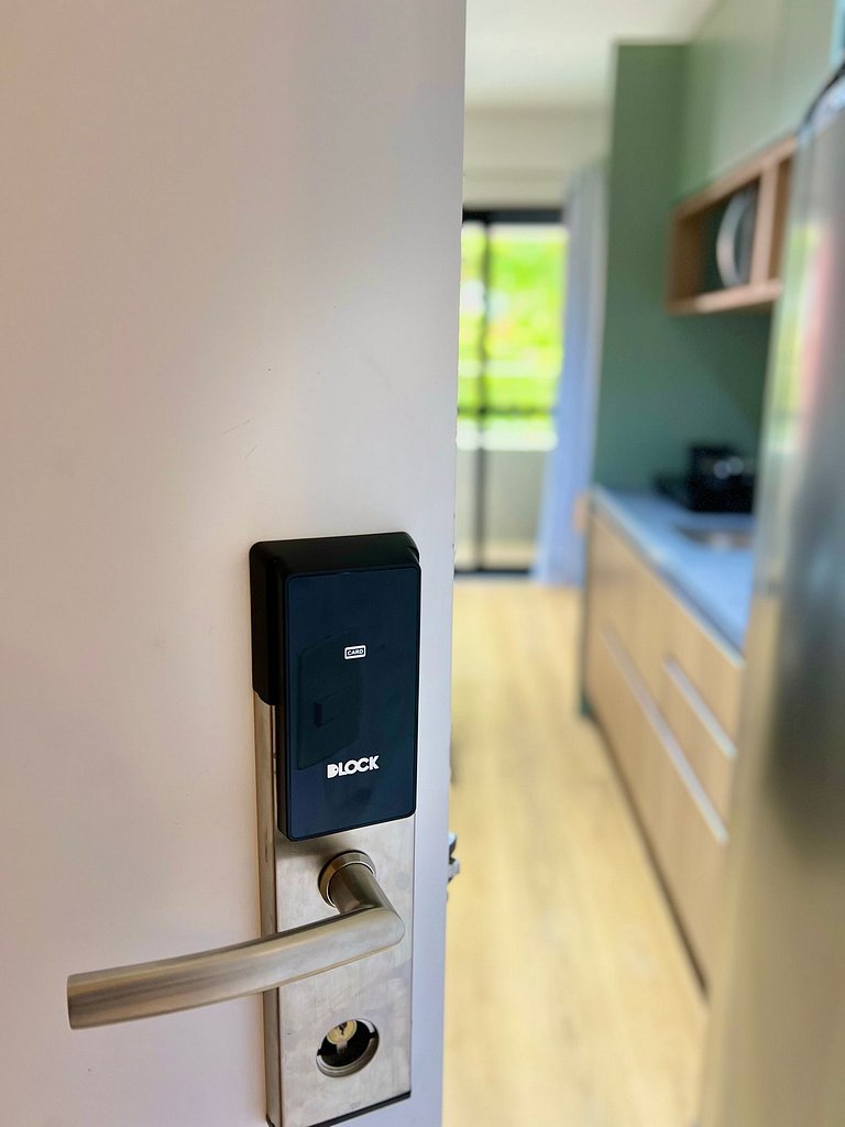 Condomínio moderno com acesso por senhas e cadastros remotos.