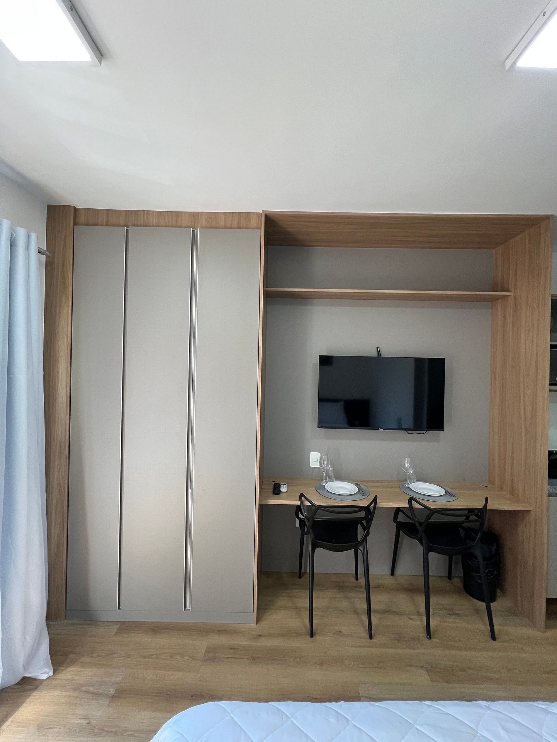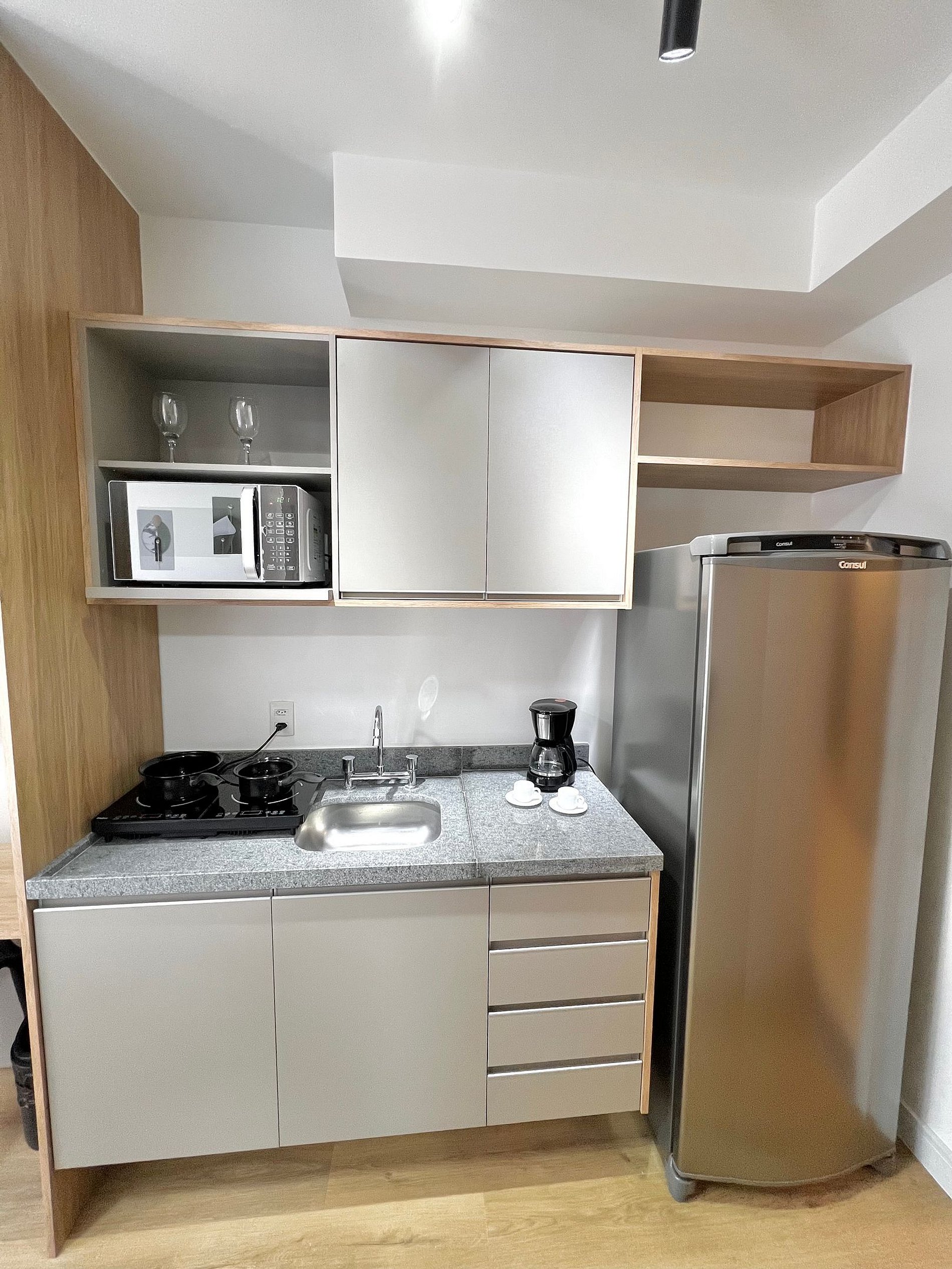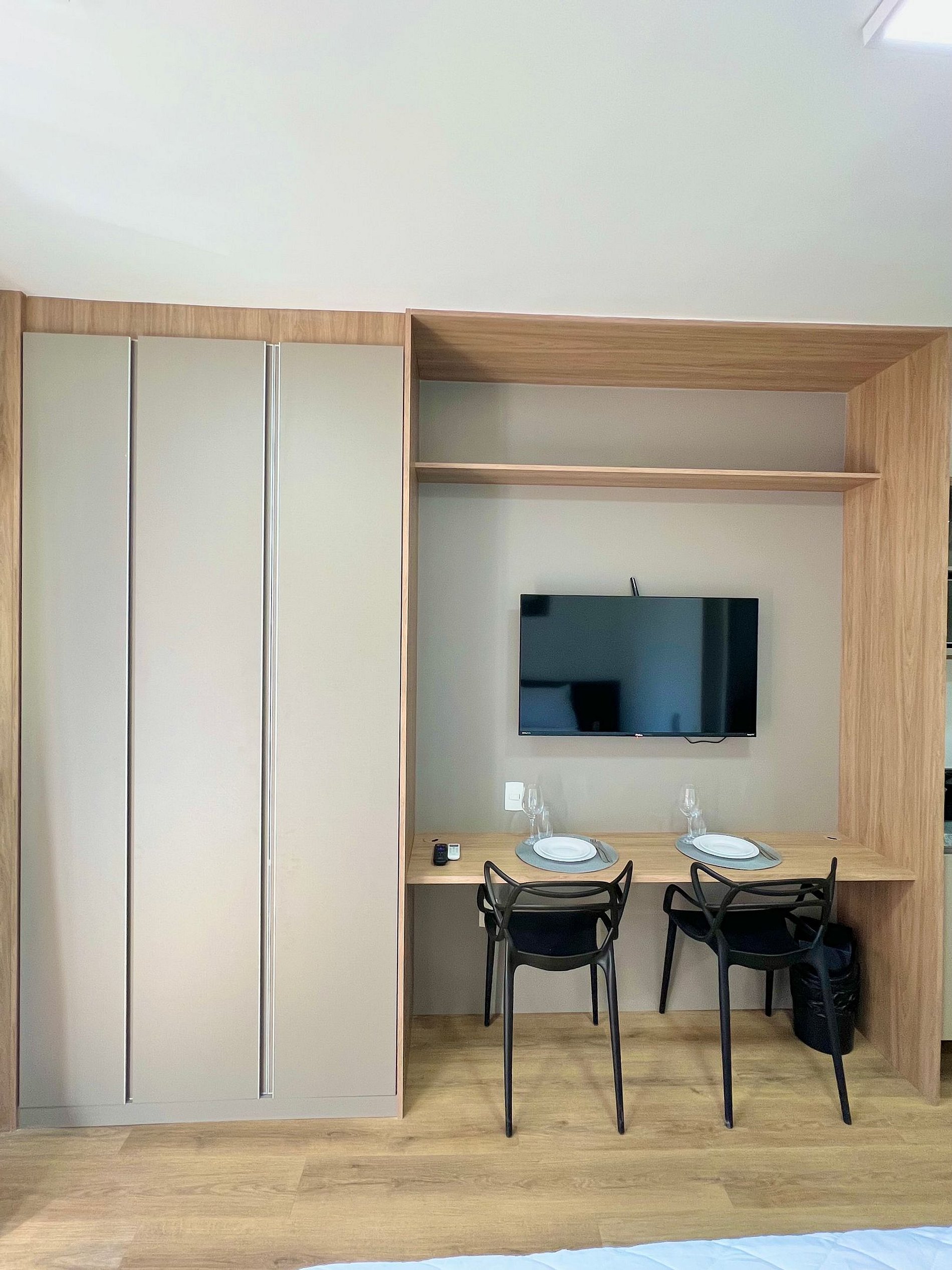 Apartamento completo, possui todos os utensílios de cozinha, roupa de cama e marcenaria planejada, tudo pensado para o seu conforto durante a hospedagem.