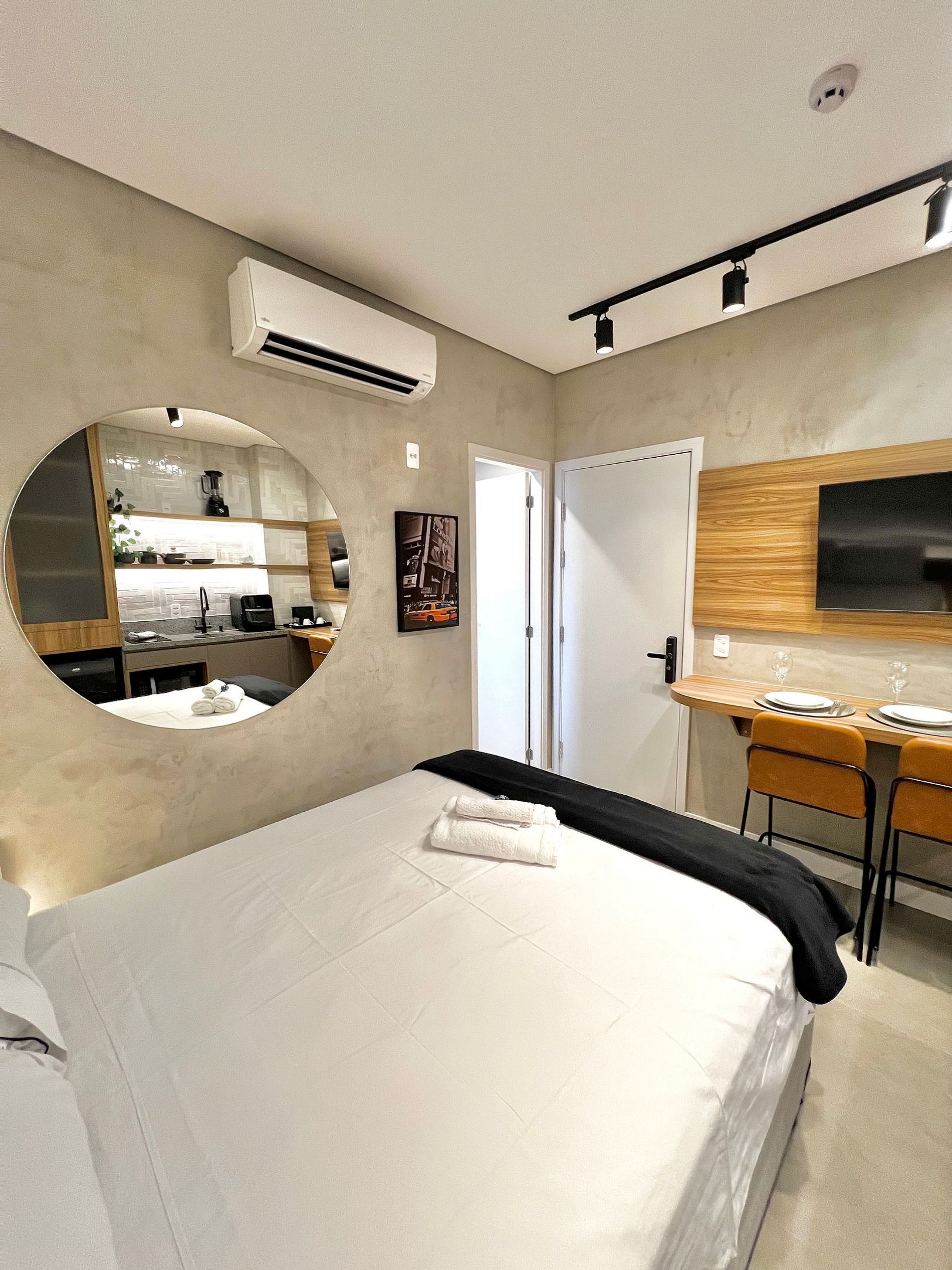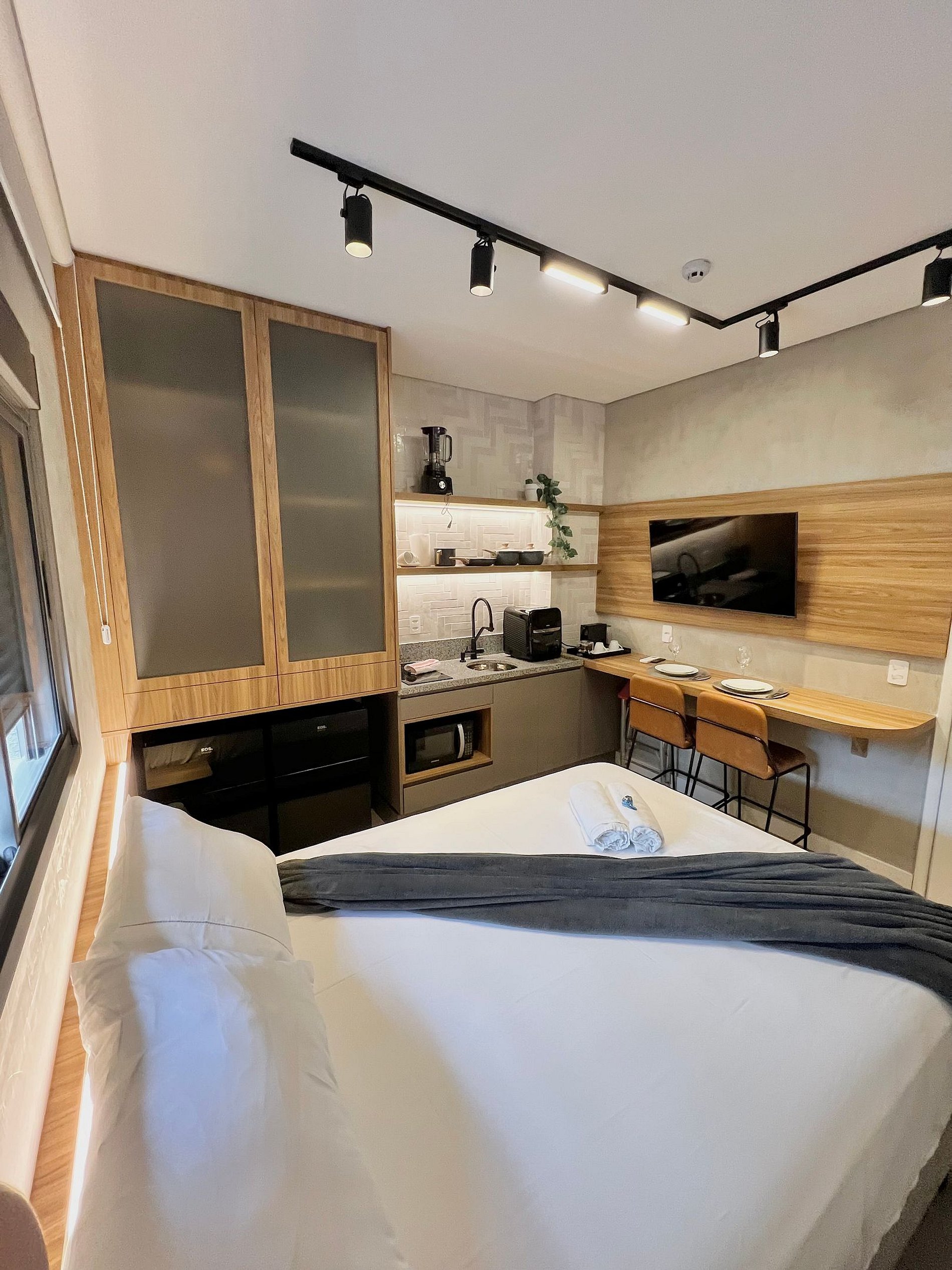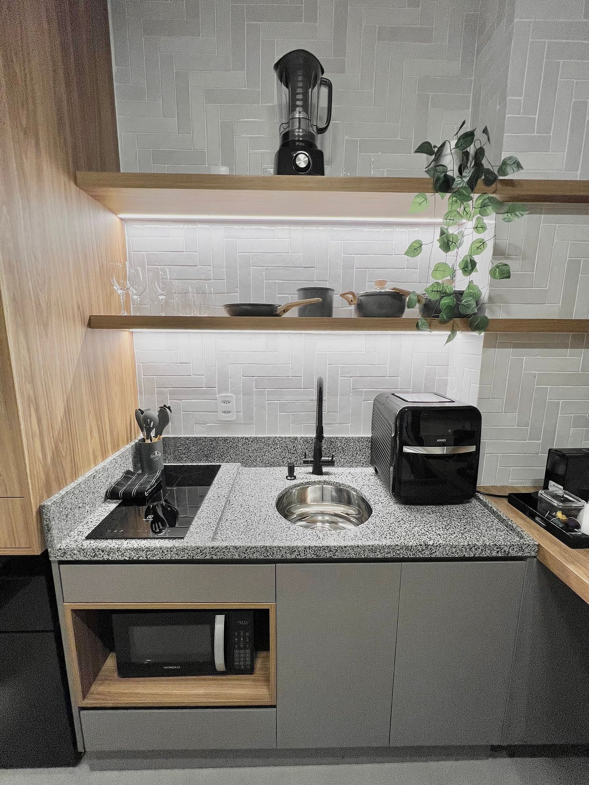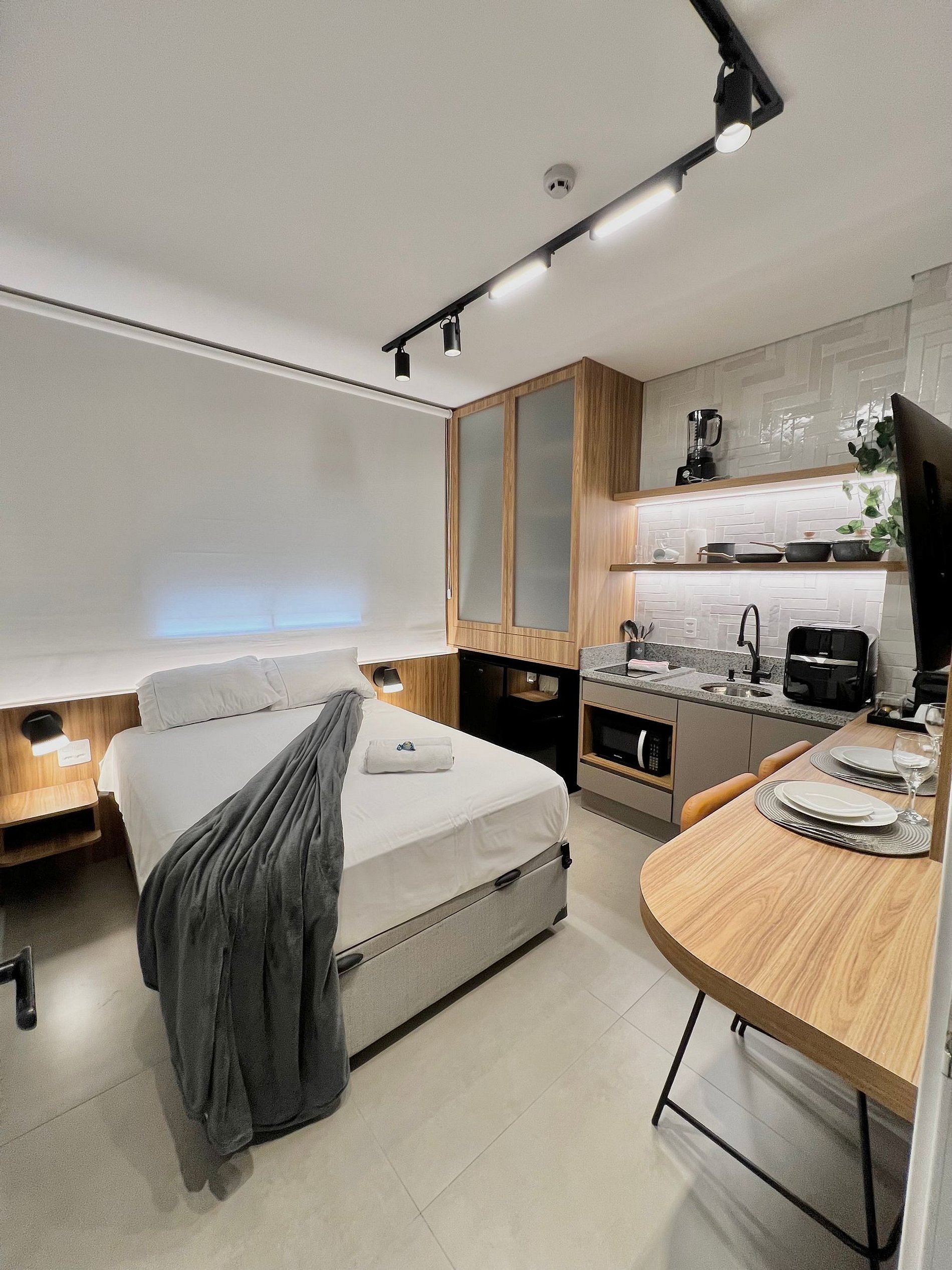 Apartamento completo, com toalhas e roupa de cama, cozinha equipada com AirFryer, microondas, cooktop, geladeira e utensílios de culinária.