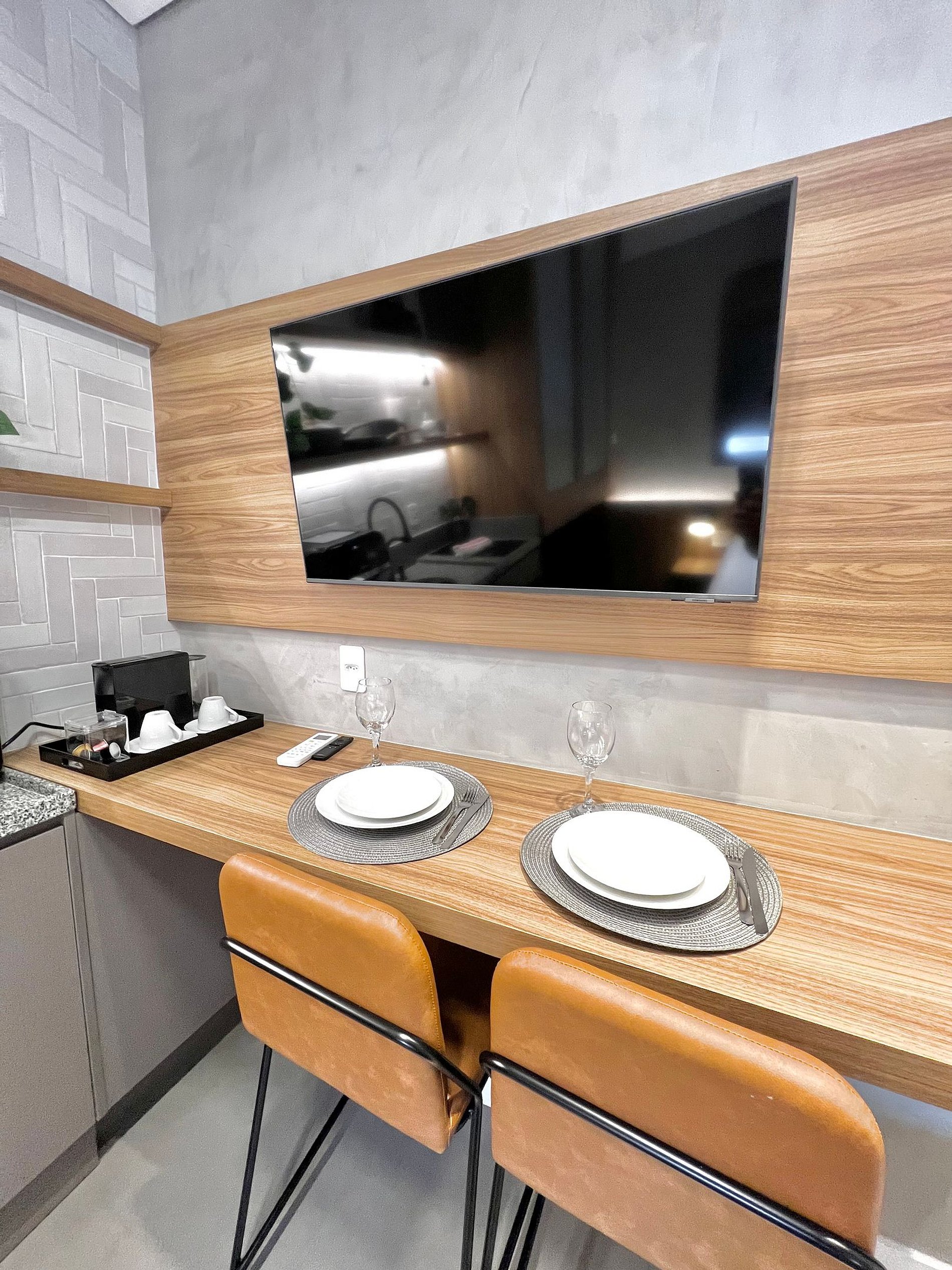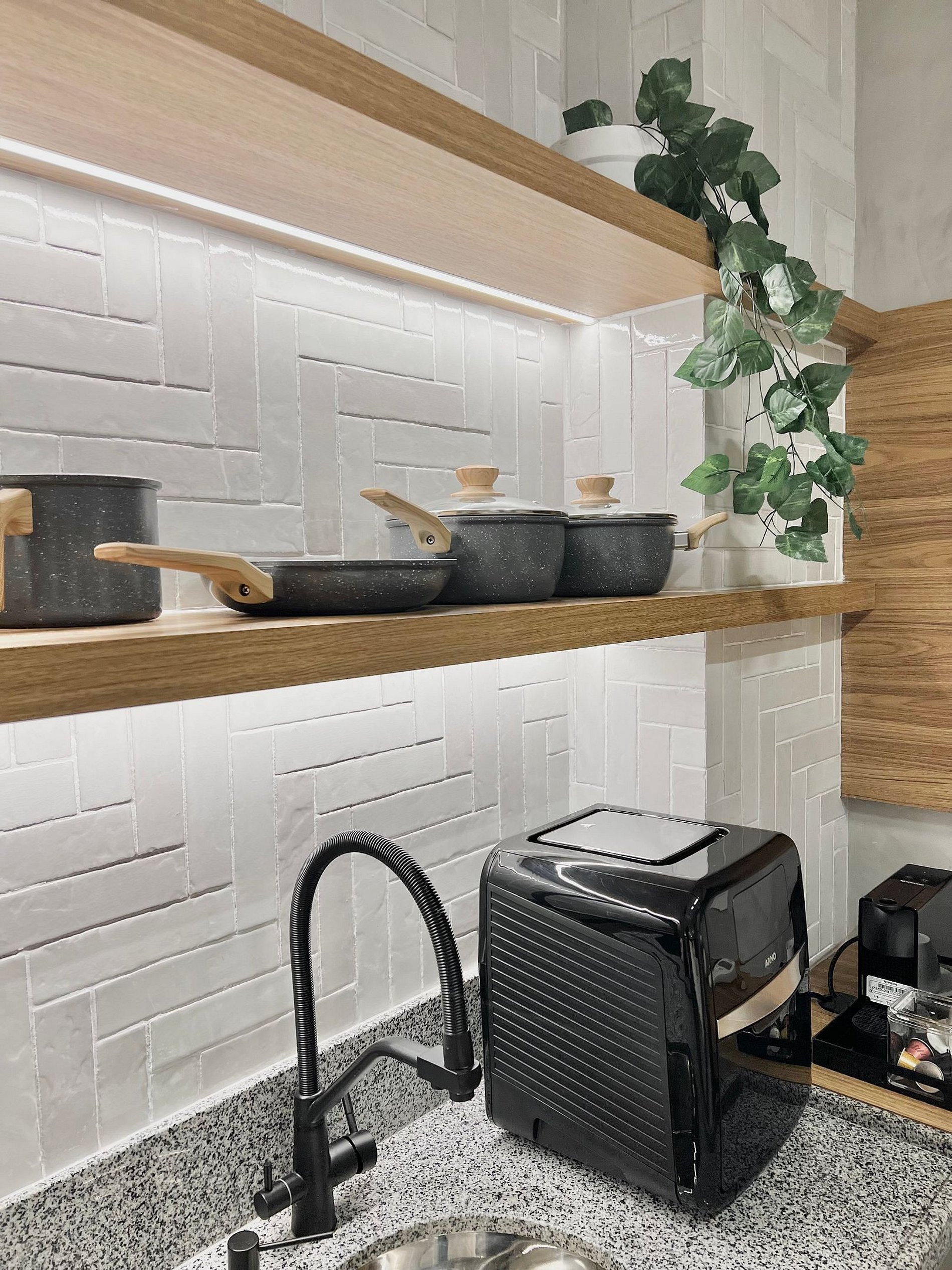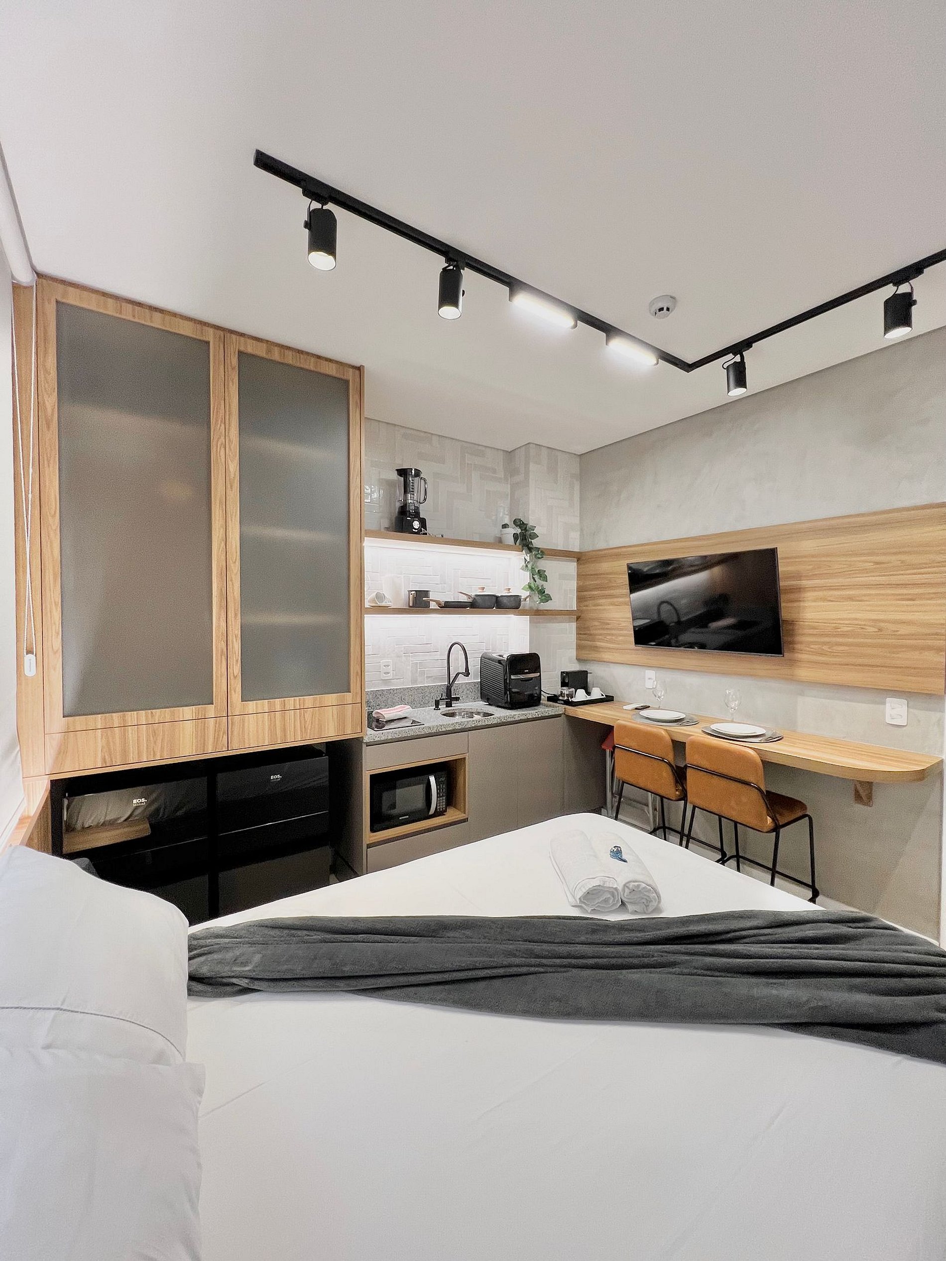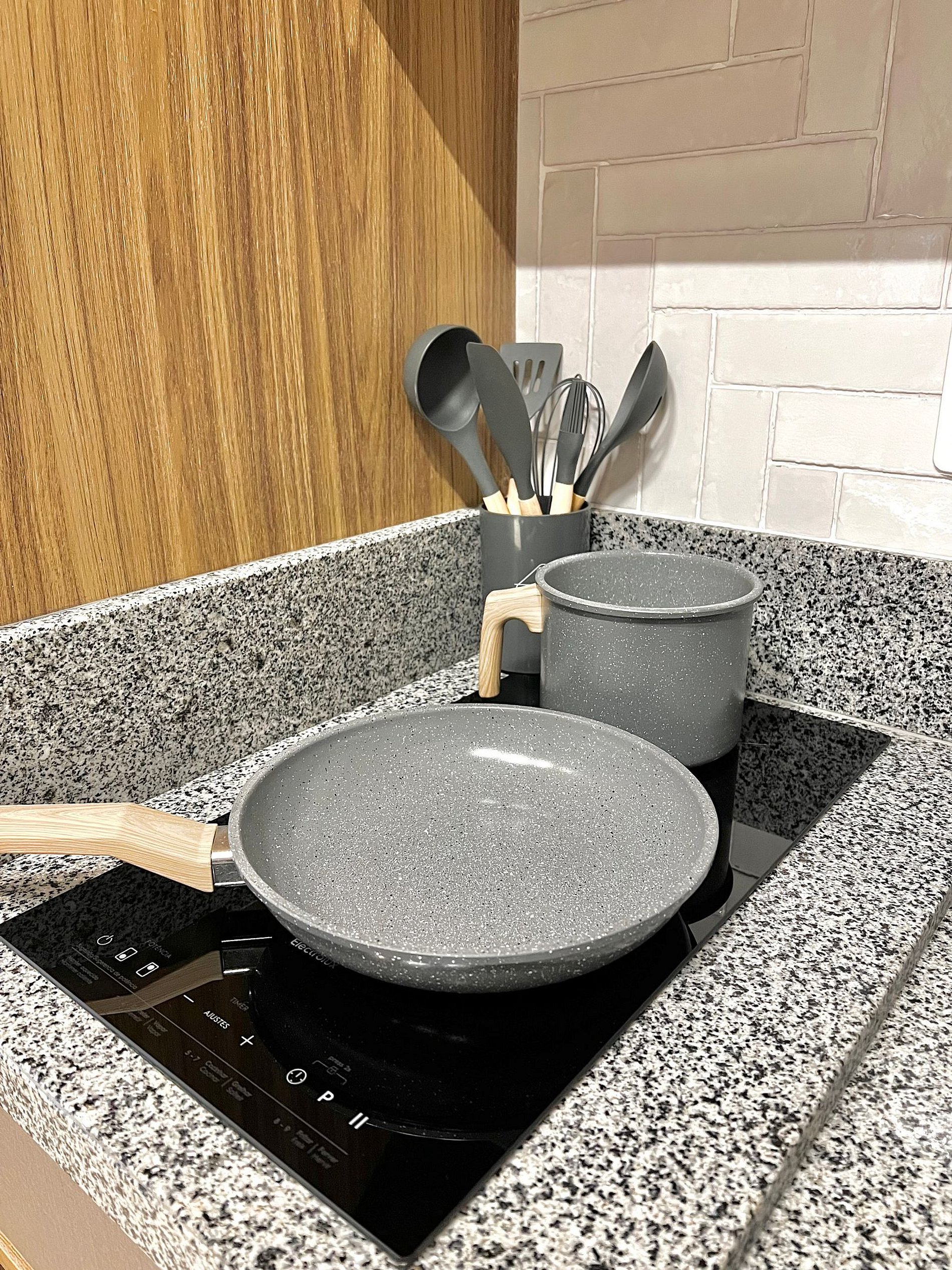 Apartamento completo, com toalhas e roupa de cama, cozinha equipada com AirFryer, microondas, cooktop, geladeira e utensílios de culinária.