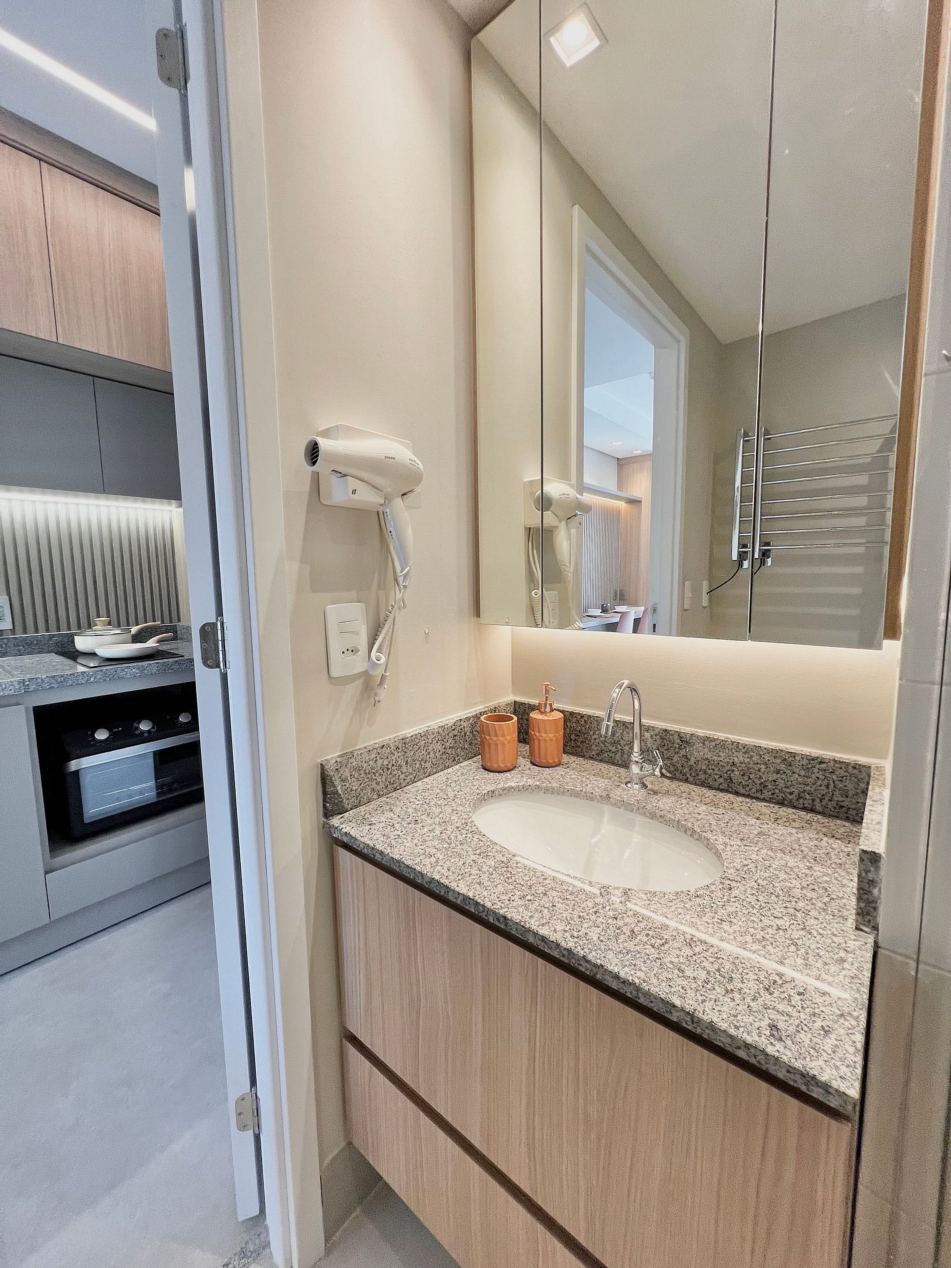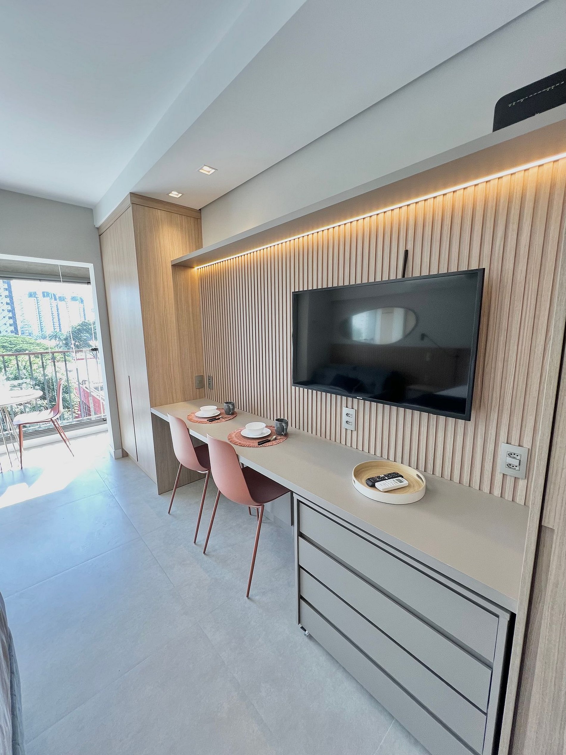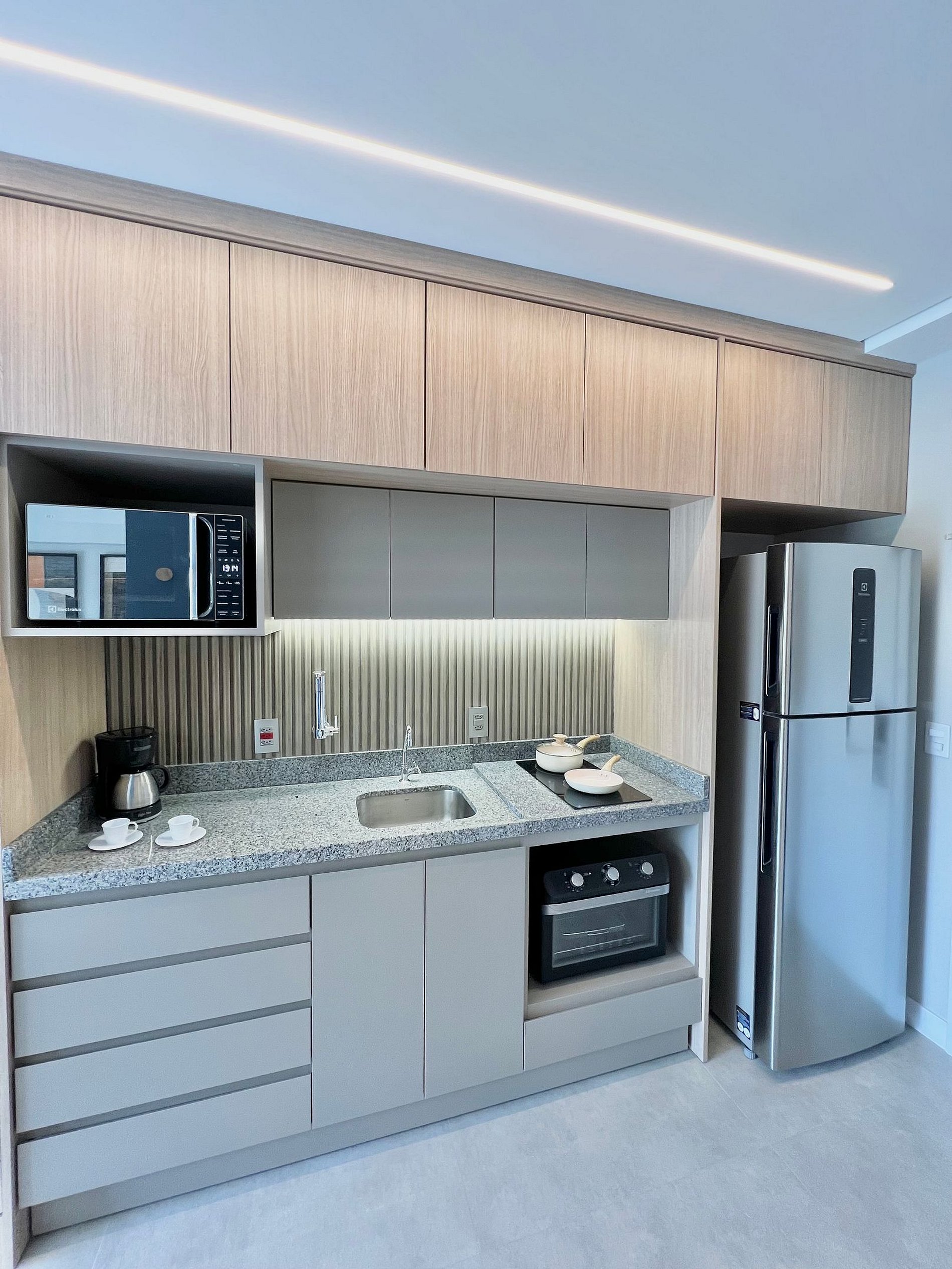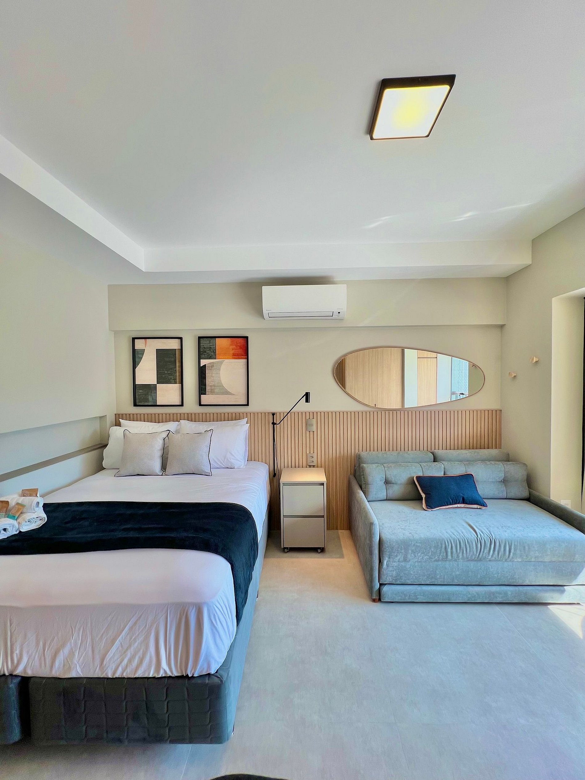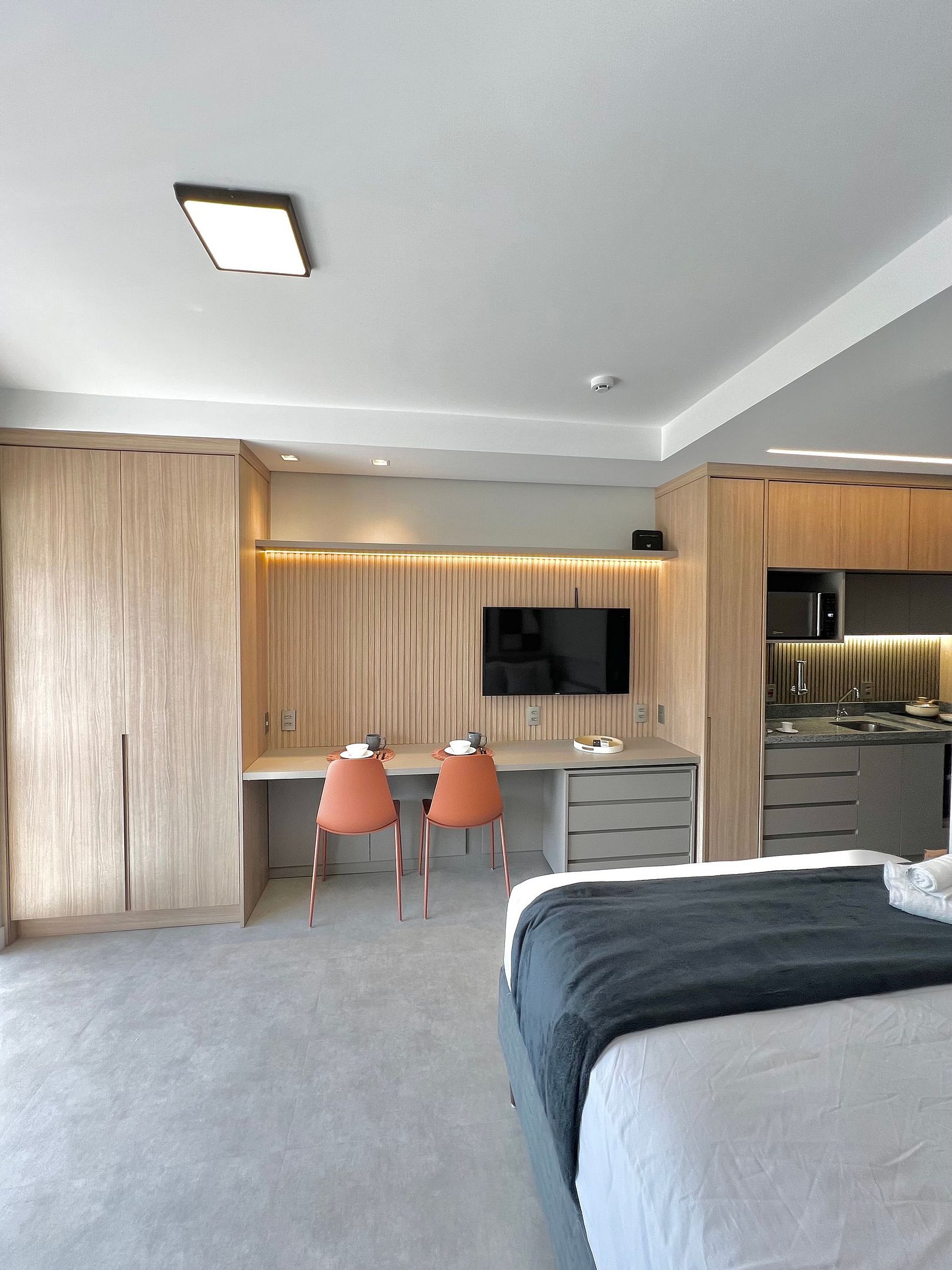 O Studio possui tudo para sua experiência e conforto, com uma cama Queen e um sofá cama super confortáveis, o apartamento está completamente mobiliado, pensado na sua comodidade e dia a dia, contém todos os itens necessários na cozinha, como forno microondas, forno elétrico, cooktop e cafeteira elétrica.