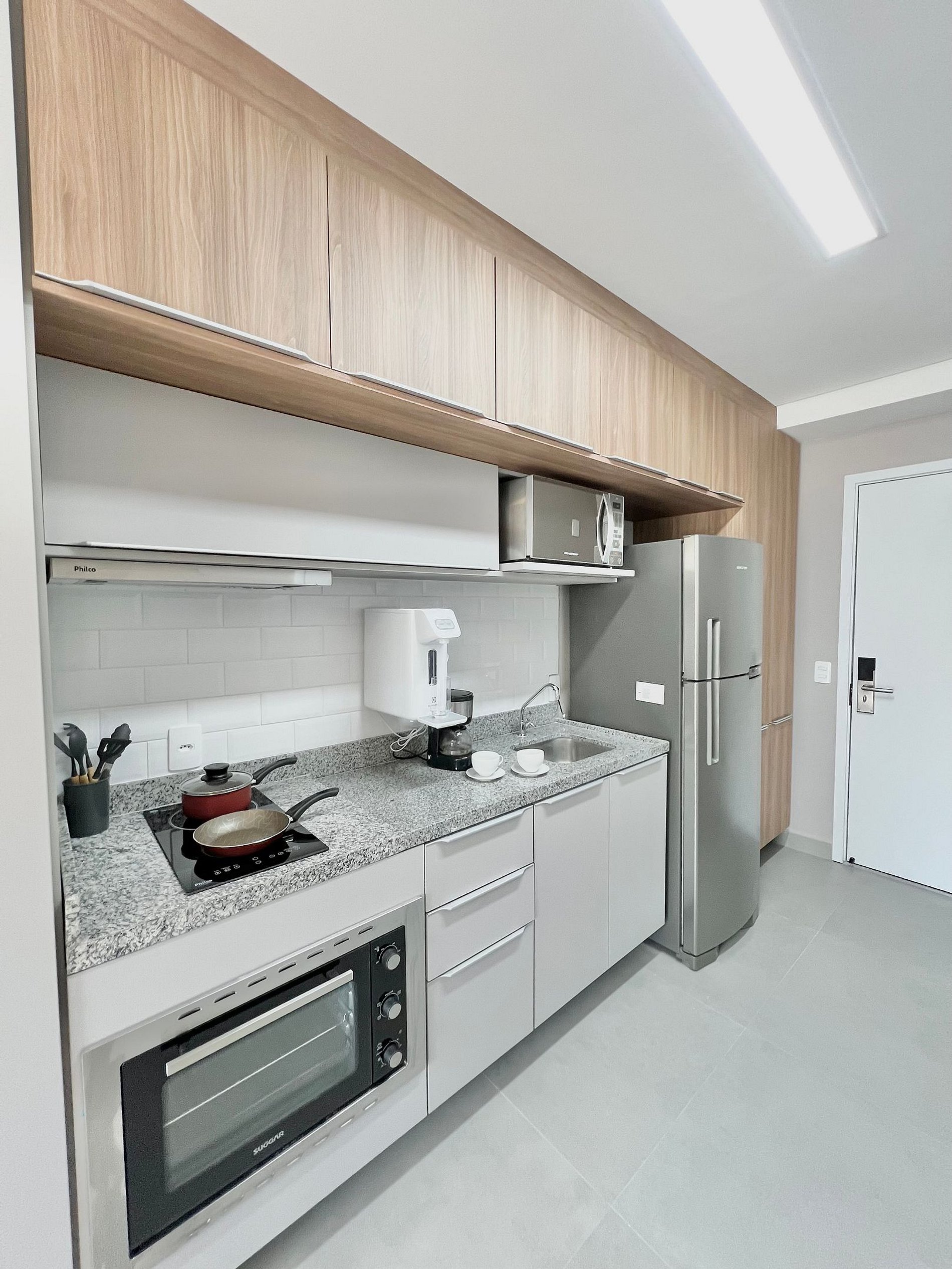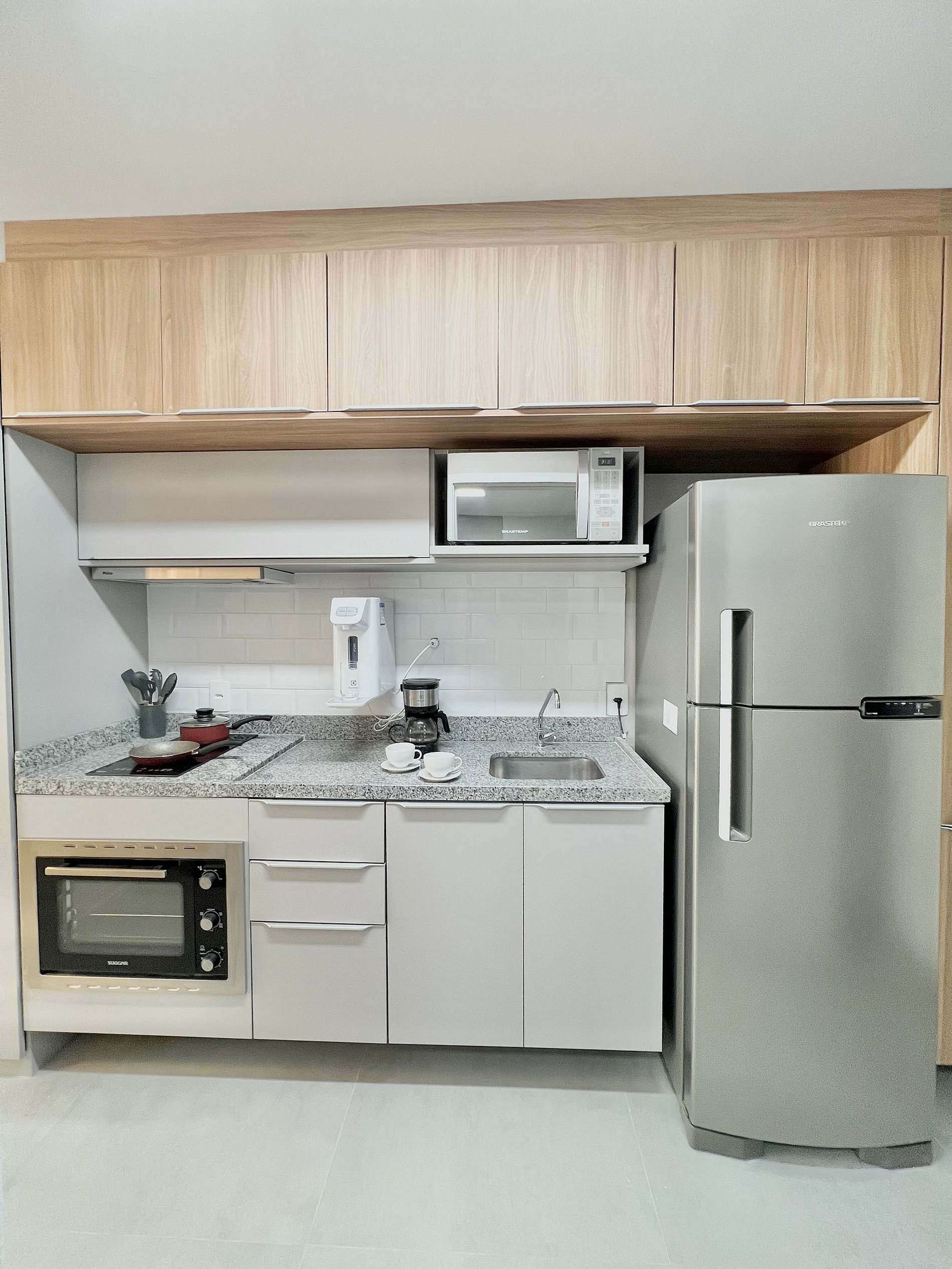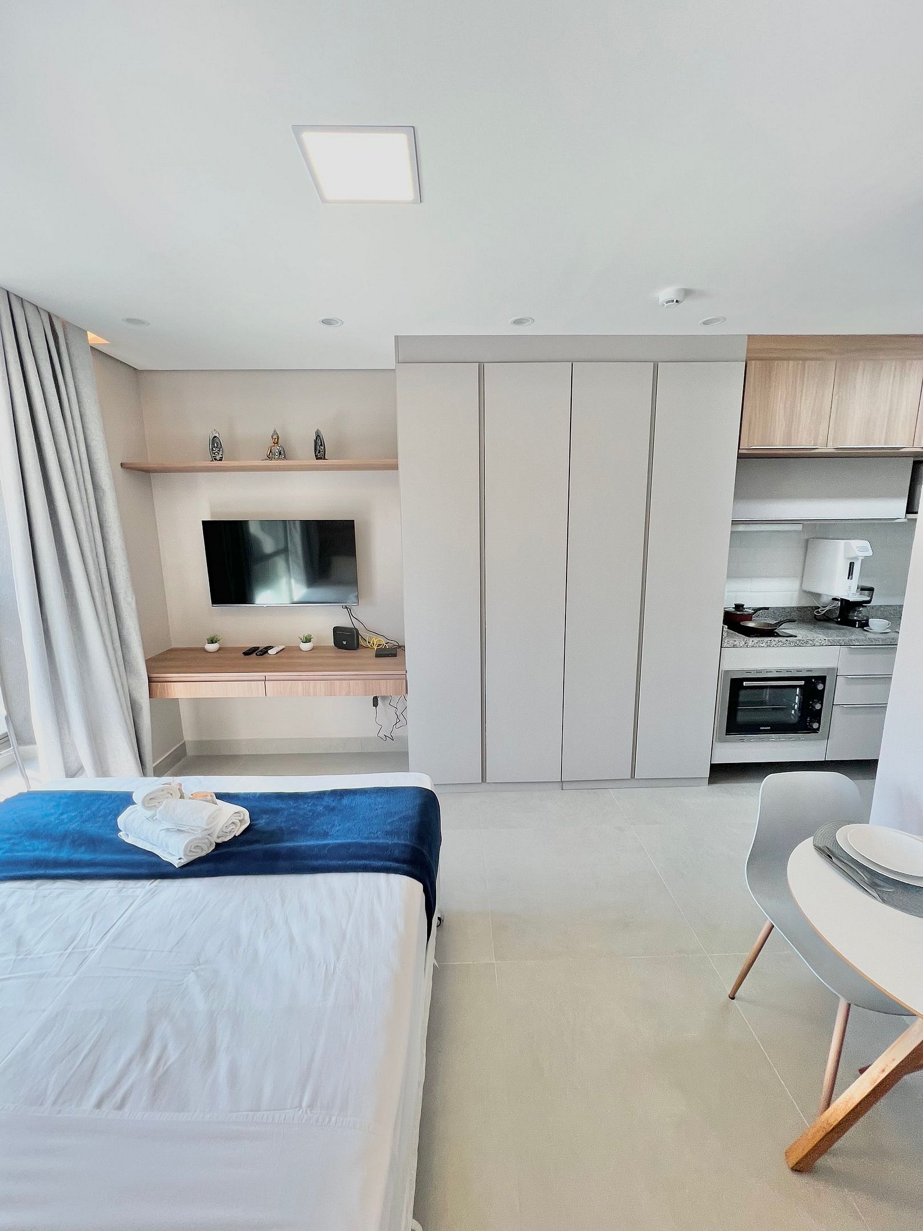 O Studio possui tudo para sua experiência e conforto, com uma cama casal, o apartamento está completamente mobiliado, pensado na sua comodidade e dia a dia, contém todos os itens necessários na cozinha, como forno microondas, forno elétrico, cooktop e cafeteira elétrica.