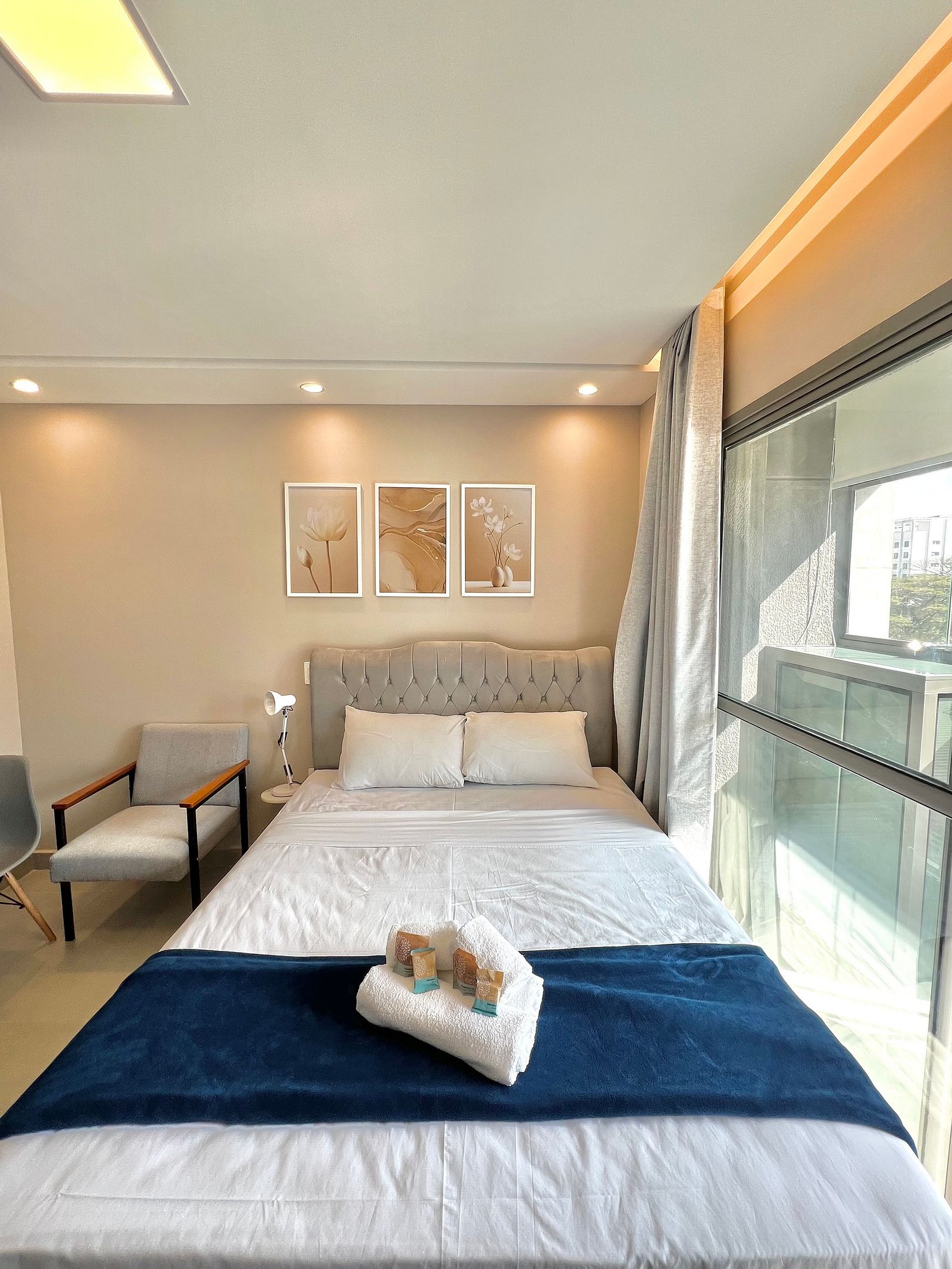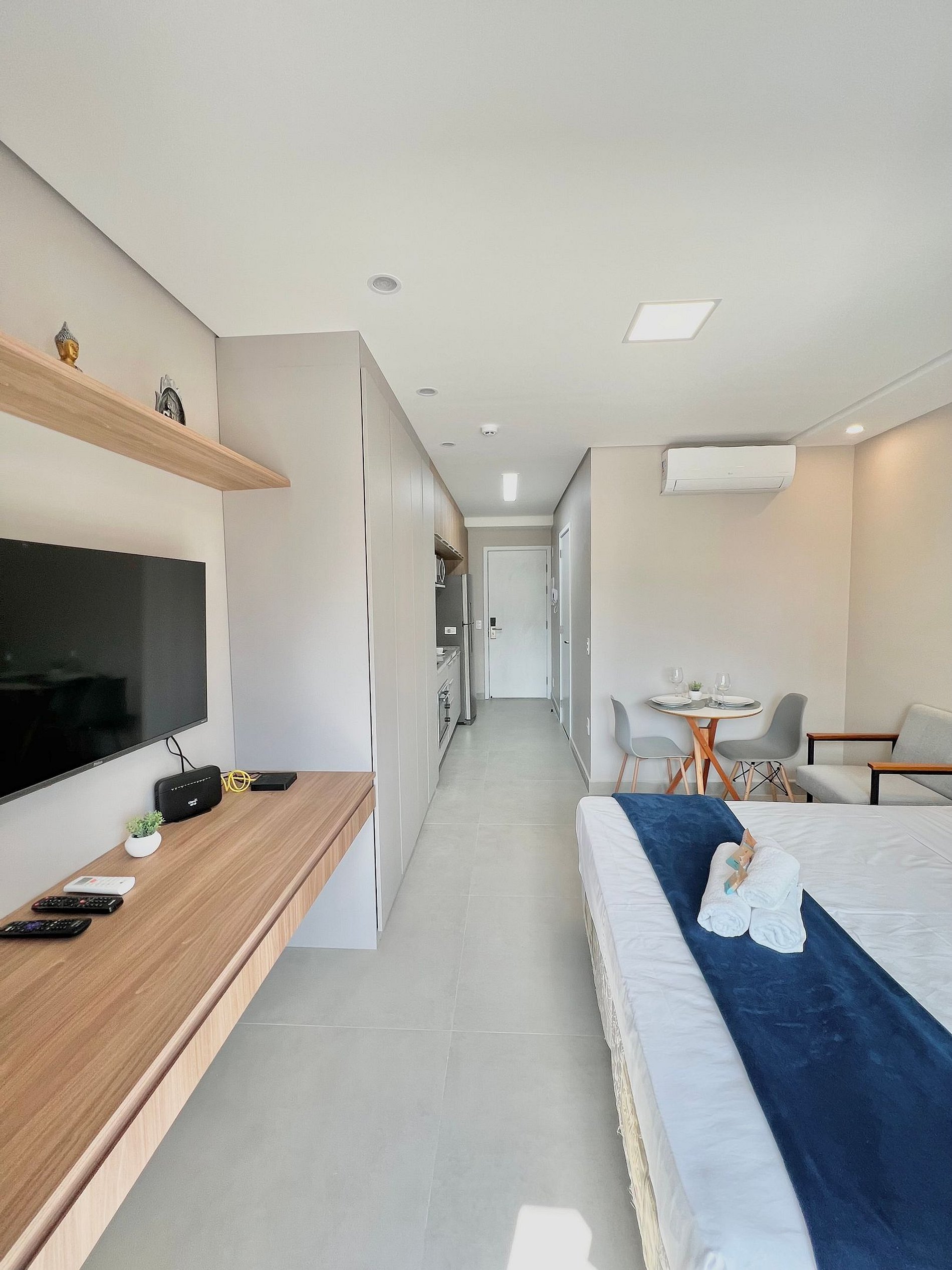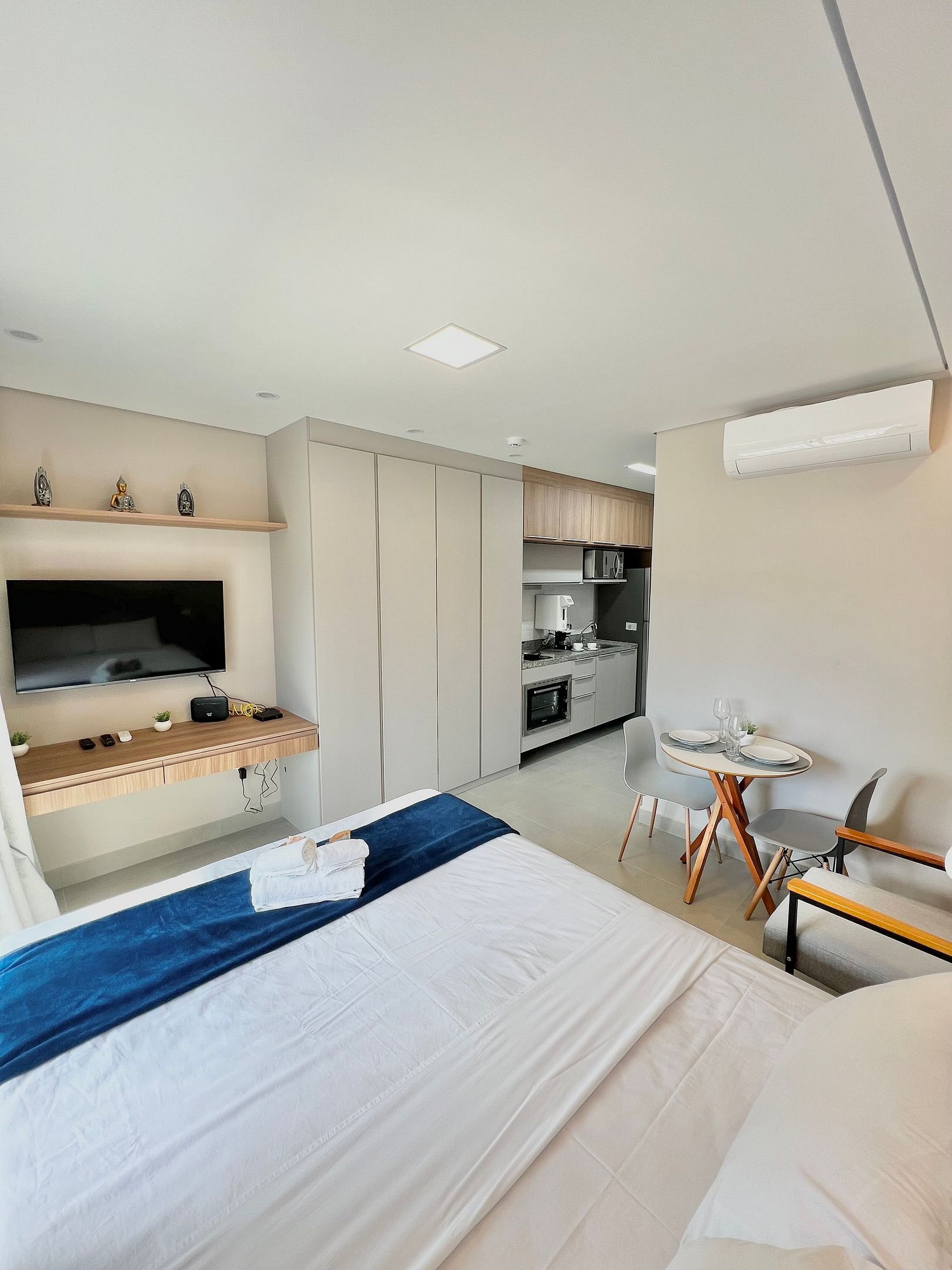 O Studio possui tudo para sua experiência e conforto, com uma cama casal, o apartamento está completamente mobiliado, pensado na sua comodidade e dia a dia, contém todos os itens necessários na cozinha, como forno microondas, forno elétrico, cooktop e cafeteira elétrica.