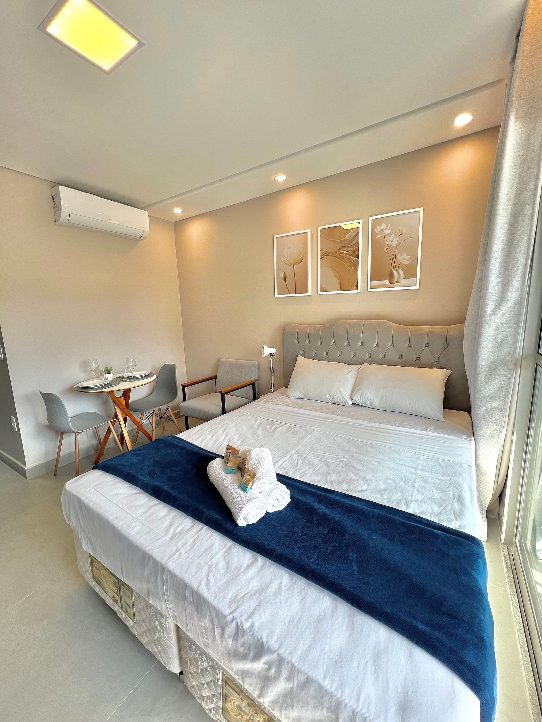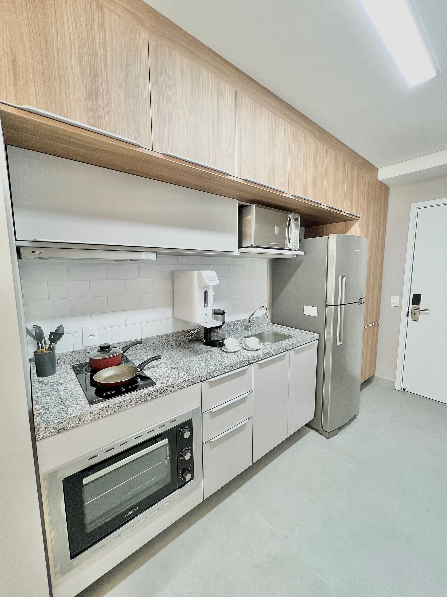 O Studio possui tudo para sua experiência e conforto, com uma cama casal, o apartamento está completamente mobiliado, pensado na sua comodidade e dia a dia, contém todos os itens necessários na cozinha, como forno microondas, forno elétrico, cooktop e cafeteira elétrica.