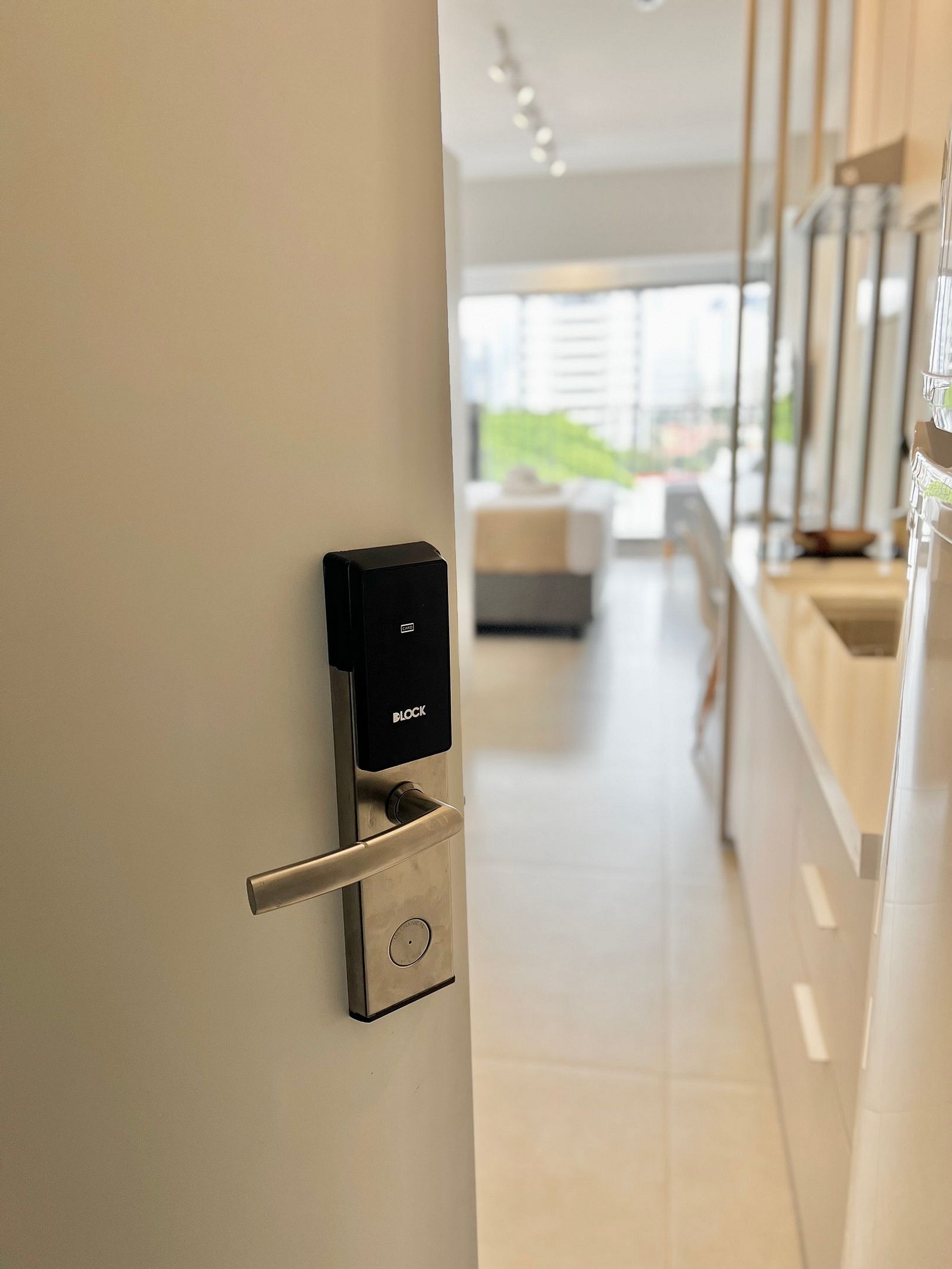 Condomínio moderno com acesso por senhas e cadastros remotos.
