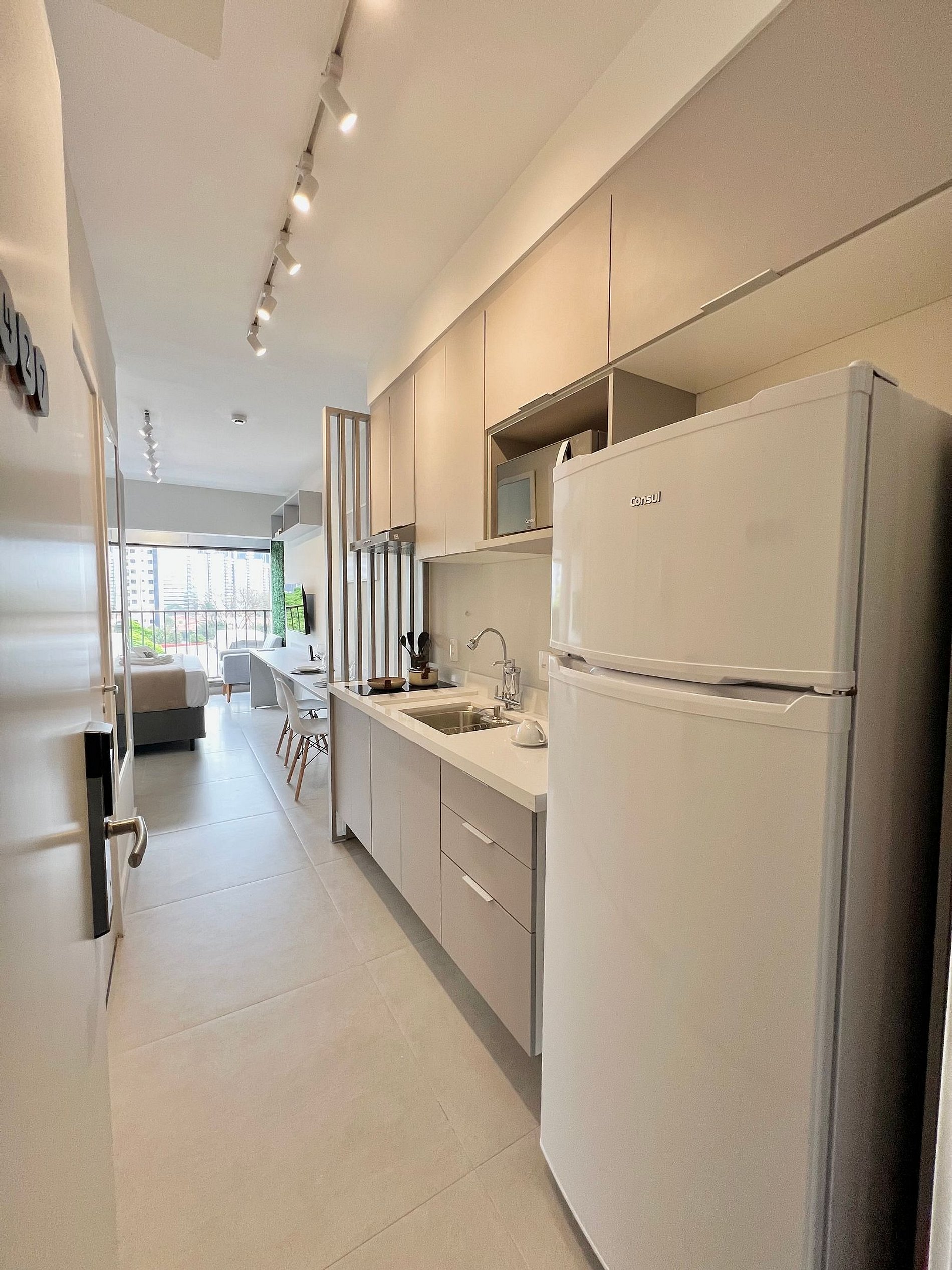 O Studio possui tudo para sua experiência e conforto, com uma cama casal confortável, o apartamento está completamente mobiliado, pensado na sua comodidade e dia a dia, contém todos os itens necessários na cozinha, como forno microondas, forno elétrico, cooktop e cafeteira elétrica.