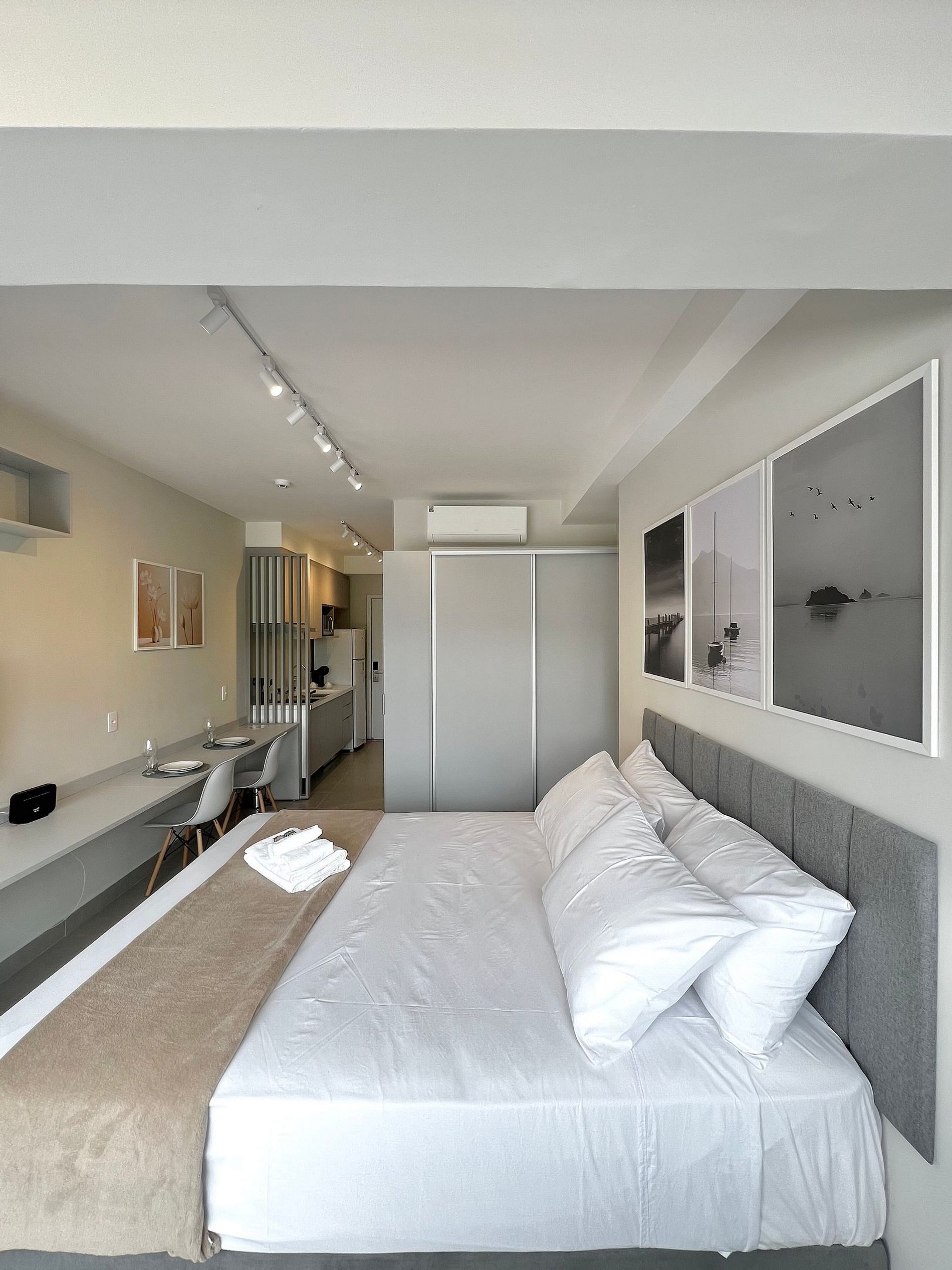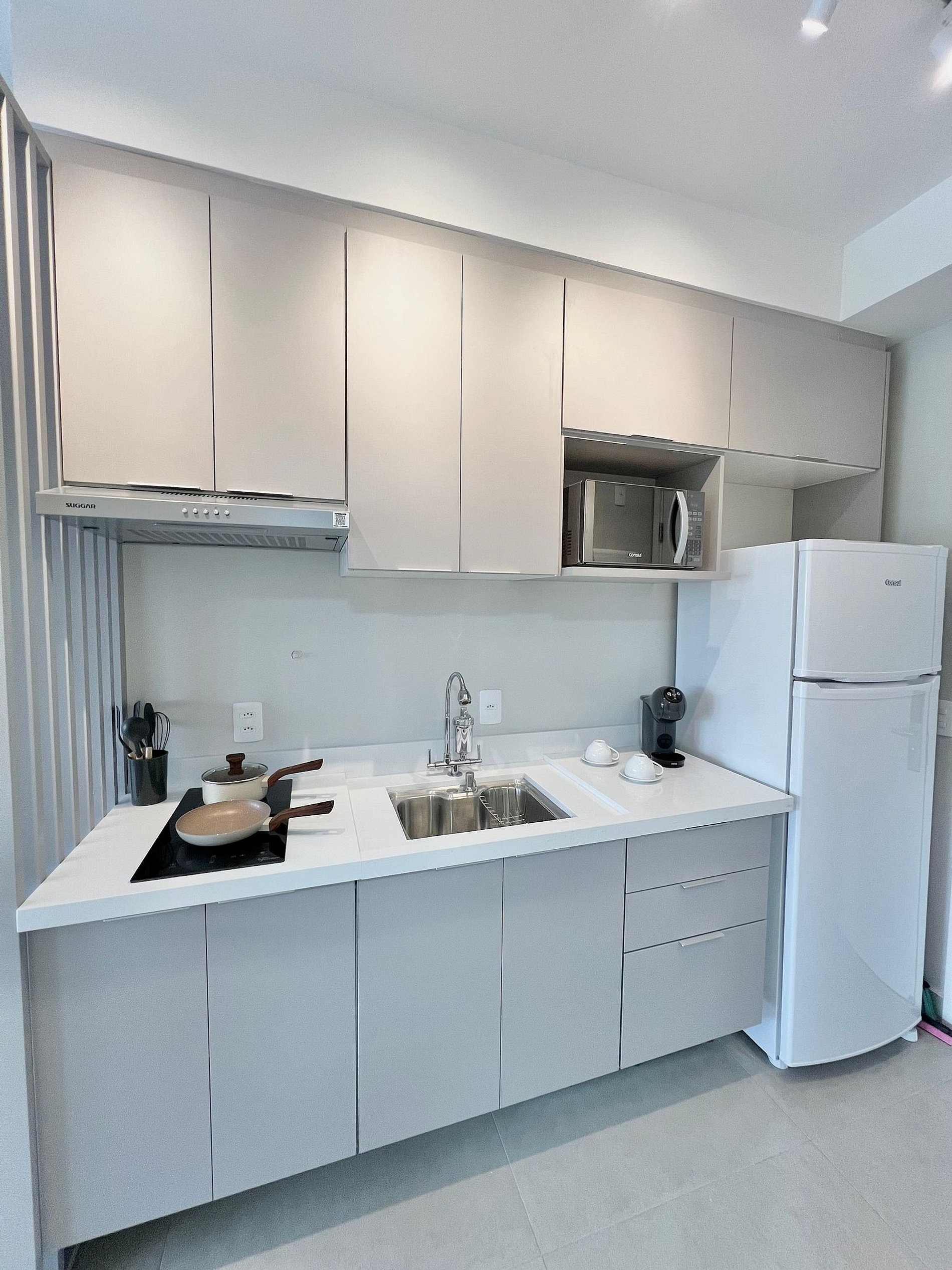 O Studio possui tudo para sua experiência e conforto, com uma cama casal confortável, o apartamento está completamente mobiliado, pensado na sua comodidade e dia a dia, contém todos os itens necessários na cozinha, como forno microondas, forno elétrico, cooktop e cafeteira elétrica.