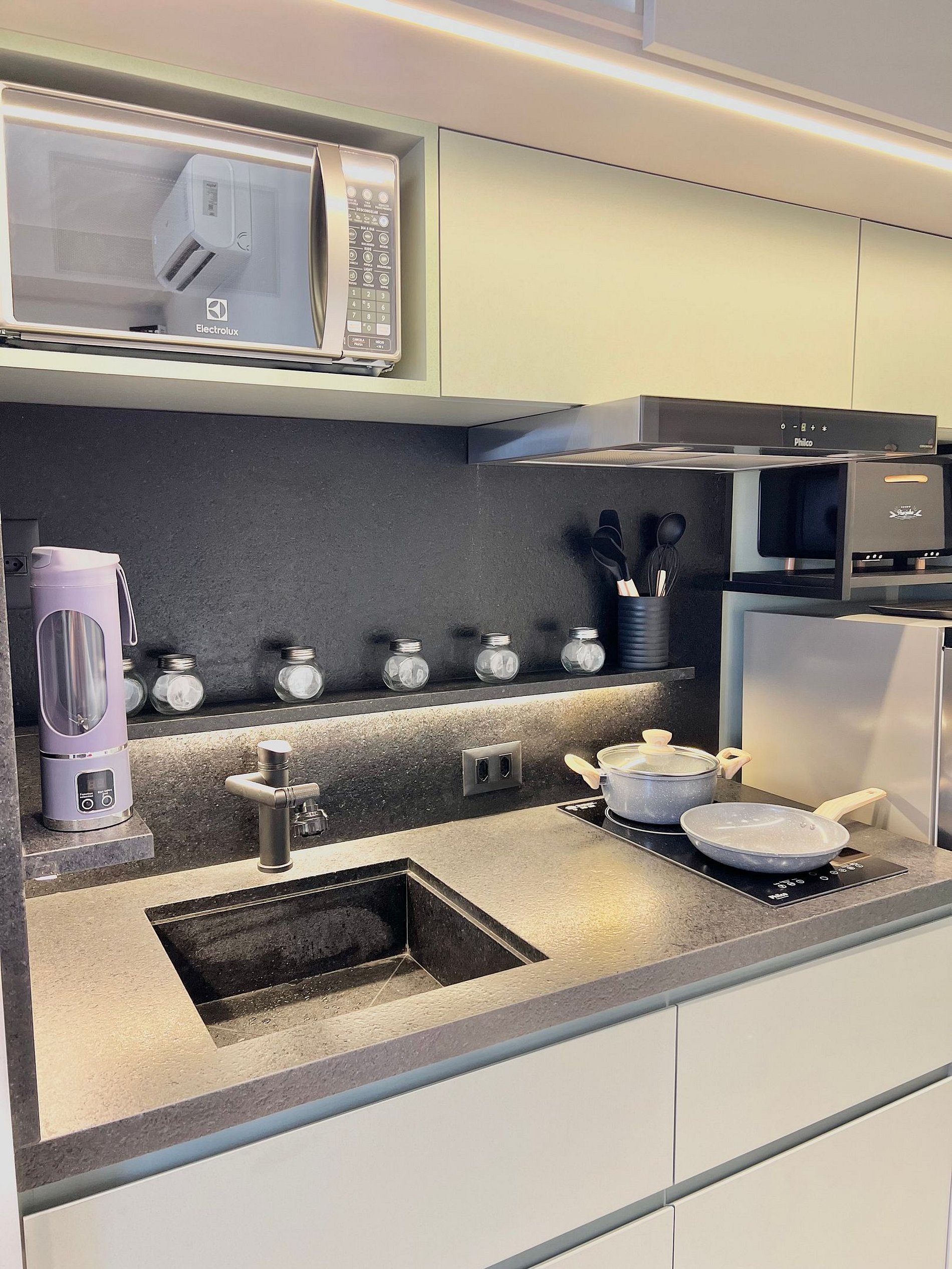 Totalmente equipado: cozinha completa com cooktop, forno, micro-ondas, geladeira, cafeteira e utensílios.